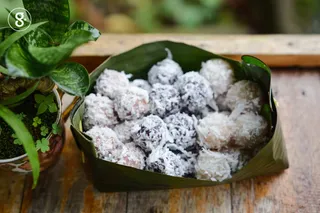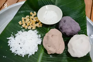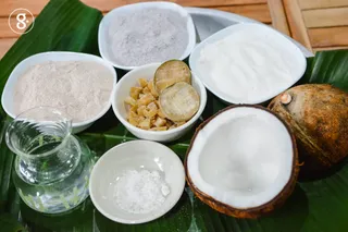 ระหว่างนี้จัดการกันน้ำตาลแว่นของเราก่อน โดยการใช้มีดหั่นออกเป็นชิ้นลูกเต๋าเล็กๆ จำนวนเท่ากับขนมที่เราจะทำ ใช้ประมาณ 4-5 แว่น ขนาดของแว่นน้ำตาลประมาณดูว่าหนึ่งชิ้นเราได้รสหวานที่กำลังดี คือไม่หวานจนเกินไป เสร็จเรื่องราวของน้ำตาลแว่นก็ต่อด้วยมะพร้าว ใช้มะพร้าวทึนทึกขูดฝอย หรือถ้าไม่มีมีดหรือกระต่ายขูดมะพร้าว อาจแกะเนื้อมะพร้าวออกมาหั่นซอย หรือสับเป็นชิ้นเล็กๆ ก็พอได้อยู่