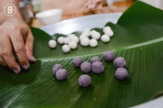 สายพันธุ์แรกคือ ‘ข้าวเหนียวเล้าแตก’ บดแป้งออกมาแล้วให้เนื้อสีขาว ต่อมาเป็น ‘ข้าวเหนียวแดง’ ให้แป้งสีแดงสมชื่อ สุดท้ายคือ ‘ข้าวเหนียวก่ำ’ หรือ ‘ข้าวเหนียวดำ’ ได้แป้งออกสีม่วงคล้ำ จากข้าวสารเราเอาเข้าเครื่องบด บดออกมาเป็นแป้งพร้อมใช้ได้เลย หรือถ้าไม่มีเครื่องบดก็สามารถเลือกซื้อแป้งข้าวเหนียวจากเกษตรกรผู้ผลิตแป้งข้าวโดยตรงก็ได้