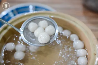 เราเริ่มขั้นตอนแรกด้วยการนำแป้งข้าวเหนียว 250 กรัม เทลงชามผสม ใช้น้ำเปล่า 110 กรัม ค่อยๆ เติมลงไป คนให้น้ำกับแป้งเข้ากัน อาจยังไม่ต้องเติมน้ำทั้งหมดทีเดียว เพราะแป้งข้าวเหนียวแต่ละชนิดหรือแต่ละสายพันธุ์อาจใช้น้ำไม่เท่ากัน นวดๆ ดูสักพัก ถ้าแห้งเกินไม่จับตัวกันก็ค่อยๆ เติมน้ำที่เหลือ ถ้าแฉะติดมือแสดงว่าเหลวเกินไป เติมแป้งอีกสักเล็กน้อย นวดดูให้เป็นเนื้อเดียวกันจนสามารถปั้นเป็นก้อนได้ พักแป้งไว้ในชามผสม ถ้าใครเคยผสมแป้งทำบัวลอย ขั้นตอนนี้ก็จะคล้ายๆ กัน