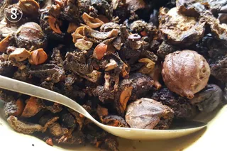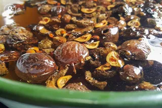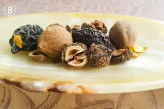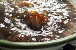 บุบผลไม้แห้งแต่ละชนิดแค่พอแตก แล้วนำไปล้างฝุ่นออก ก่อนใส่ลงหม้อเคลือบ หม้อดิน หรือ หม้อสเตนเลส (สามชนิดนี้เท่านั้น เลือกใช้อย่างใดอย่างหนึ่ง)