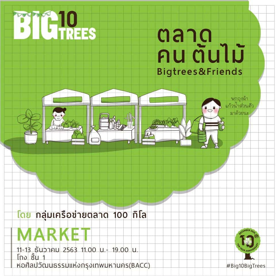 Big Trees หรือกลุ่มอนุรักษ์ต้นไม้ใหญ่ในเมืองกำลังจะมีอายุครบ 10 ปีแล้ว เทศกาลต้นไม้ใหญ่ครั้งที่ 3 นี้เลยจัดยิ่งใหญ่สักหน่อย ในงานเต็มไปด้วยกิจกรรมสนุกกับธรรมชาติ การปลูกต้นไม้ การตัดแต่งกิ่งต้นไม้ ธรรมชาติบำบัด มีเวิร์กช็อป บอร์ดเกมสิ่งแวดล้อม มีเสวนา นิทรรศการ ตลาด คน ต้นไม้ ศิลปะและดนตรี และการเปิดตัว ‘มูลนิธิรักษ์ไม้ใหญ่’ แนะนำให้กดเข้าไปดูเพจก่อน เพราะเขามีอัพเดตกิจกรรมให้ตื่นเต้นเตรียมพร้อมก่อนไปงานเรื่อยๆ เลยล่ะ