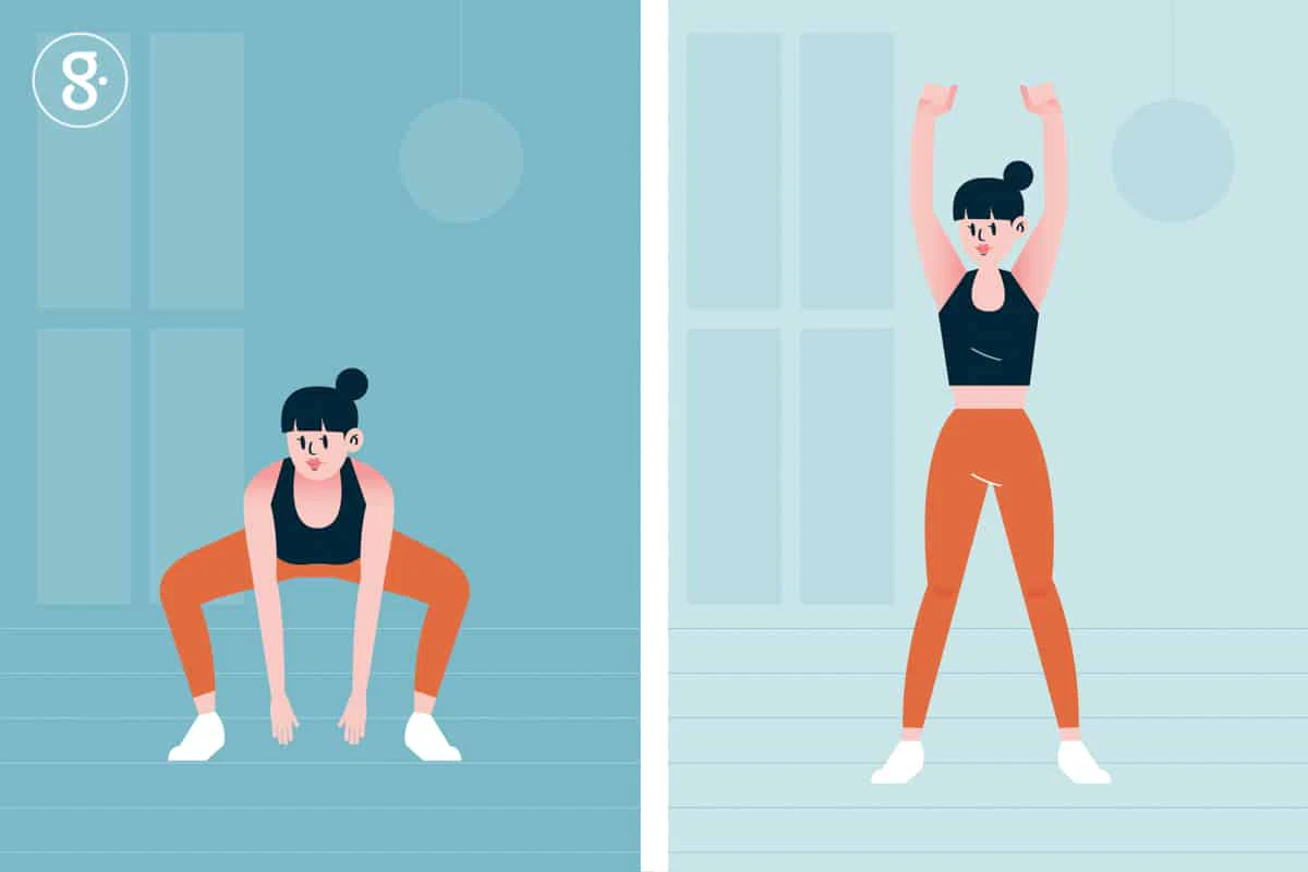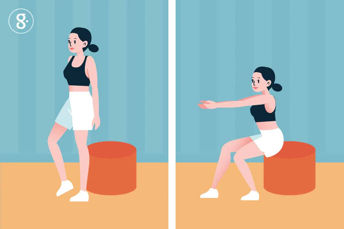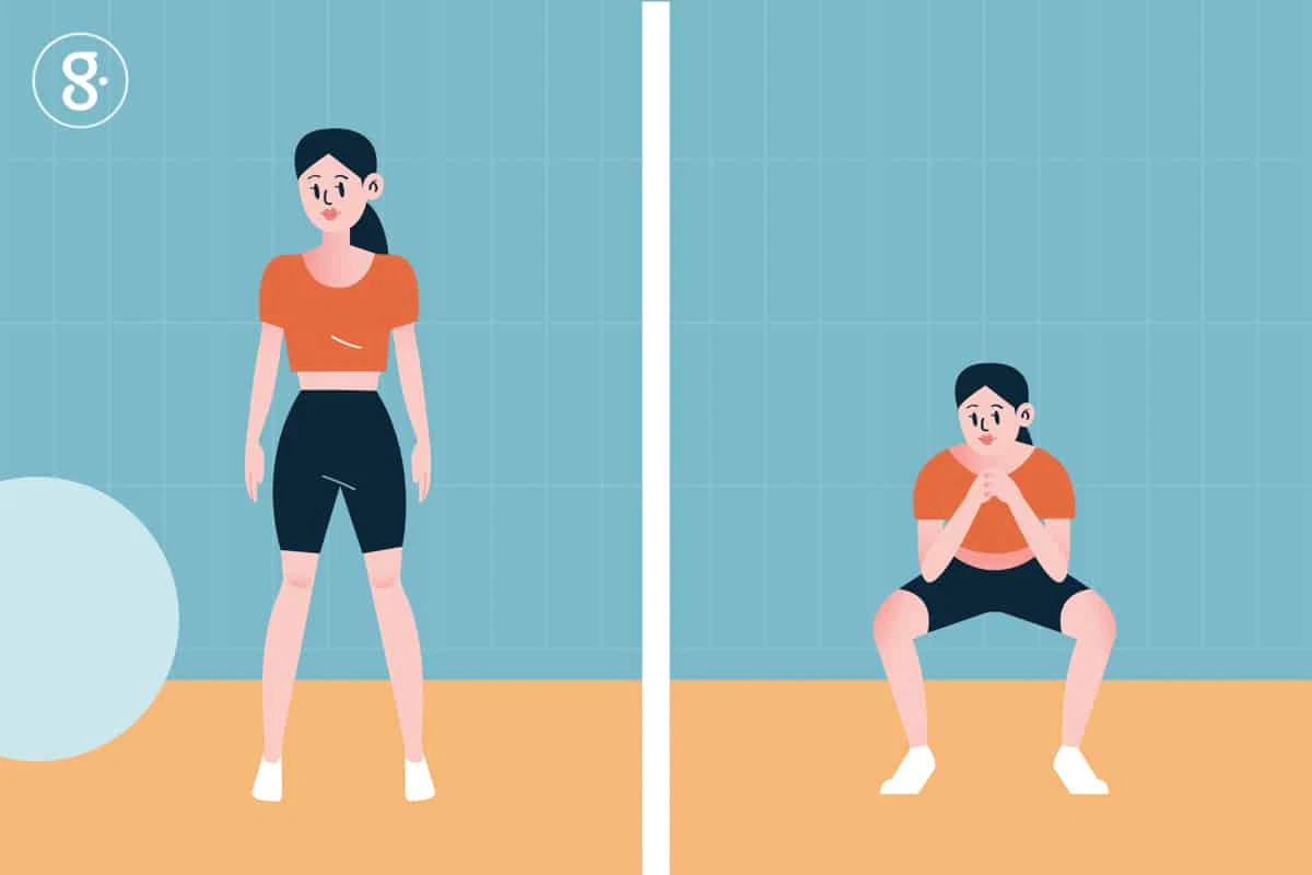 2. ย่อเข่าลง หลังตรง เกร็งหน้าท้อง แต่อย่ากลั้นหายใจ ยื่นแขนมาประสานไว้ข้างหน้าเพื่อทรงตัว ขณะย่อเข่าต้องไม่ให้หัวเข่าเลยปลายเท้า ย่อลงไปให้ได้มุมเข่า 90 องศา