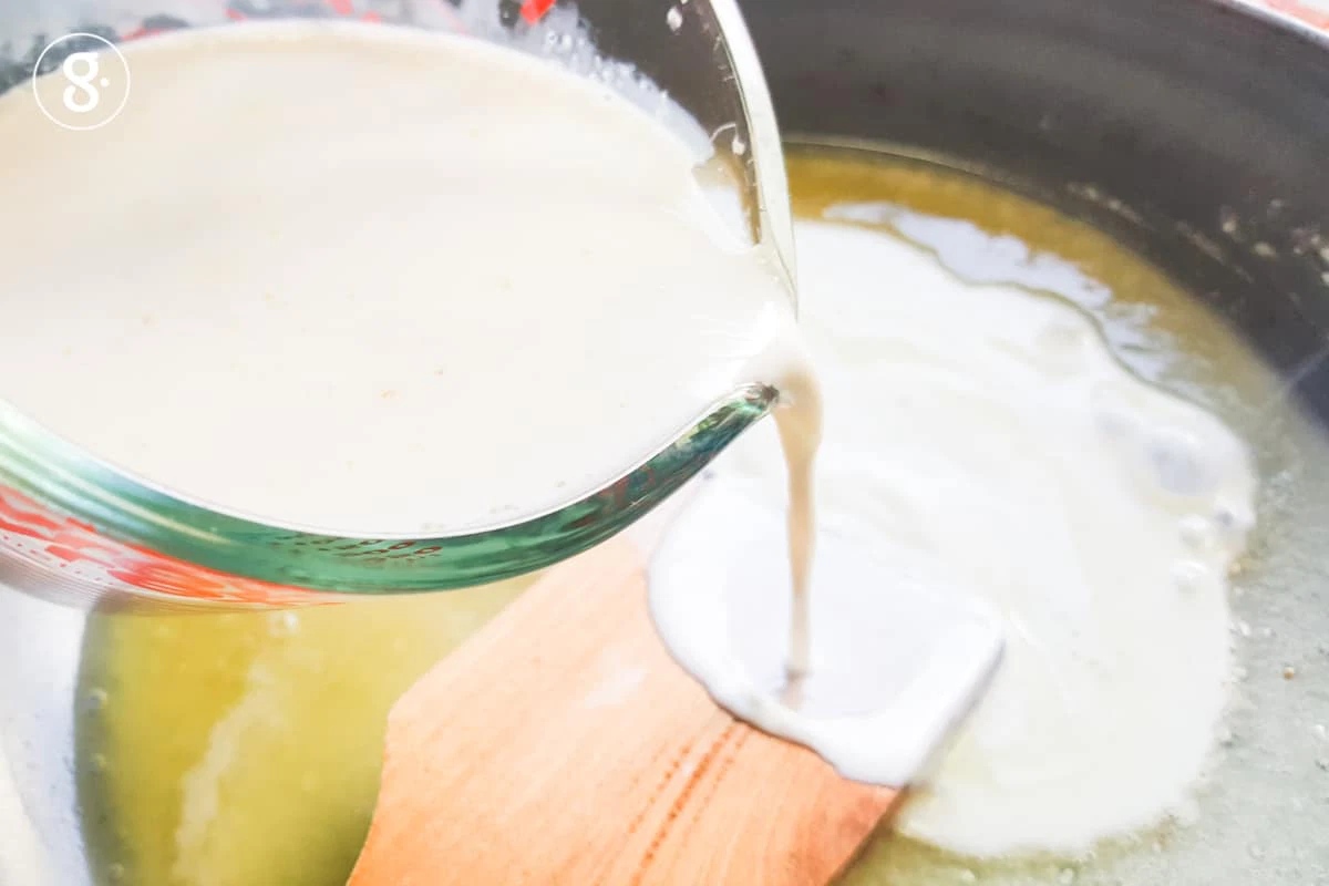 6. จากนั้นค่อยๆ รินนมลงไป ใช้ตะกร้อมือคนให้เหนียวข้น ปรุงรสด้วยเกลือและพริกไทยขาวสวน ปิดไฟ