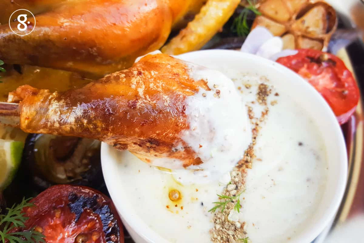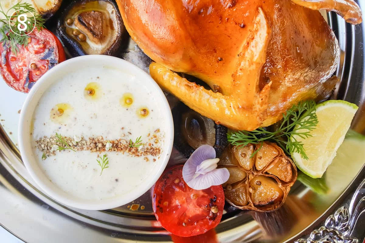 มะเขือเทศเนื้อ เห็ดหอมสดดอกใหญ่ หรือเห็ดพอร์ทาเบลโล่ มะนาว ดอกไม้กินได้สำหรับตกแต่ง ช่อผักชีสำหรับตกแต่ง พริกไทยขาวสวนป่น สำหรับโรยบนไก่ที่อบสุกแล้วตามชอบ