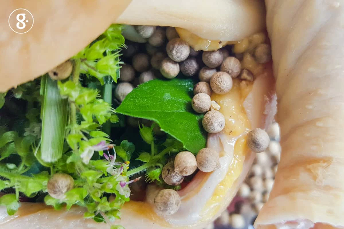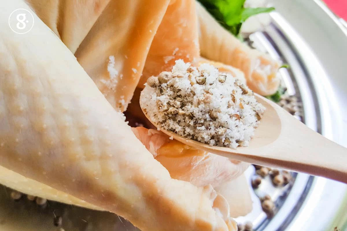 2. จากนั้นแบ่งเกลือบ่อกฐินที่ตำกับพริกไทยขาวสวนมาครึ่งหนึ่ง ใส่ลงในท้องไก่ พร้อมช่อสมุนไพร กระเทียม พริกไทยขาวสวนทั้งเมล็ด แล้วใช้เชือกรัดตัวไก่ให้แน่นเพื่อจัดทรงให้สวย นำไปวางบนถาด