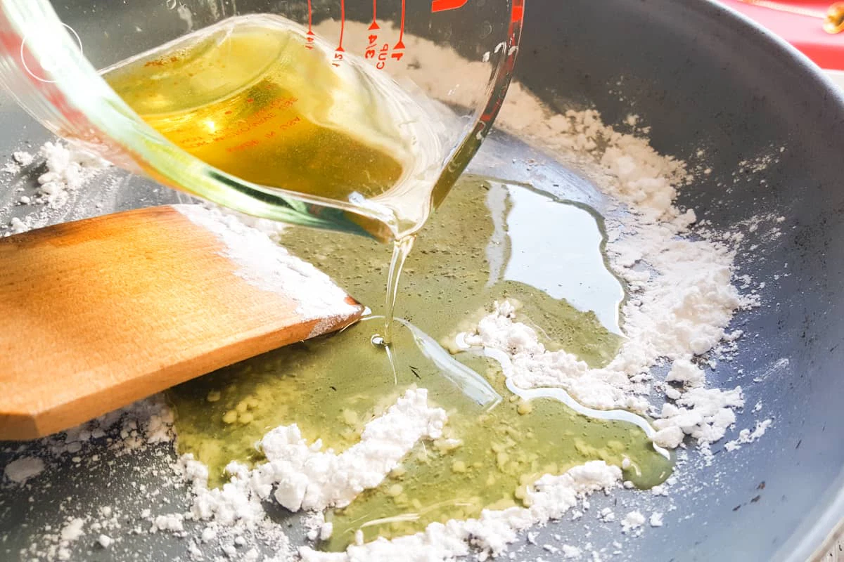 5. ทำน้ำเกรวี่ โดยผัดแป้งสาลีออร์แกนิกกับน้ำมันรำข้าว น้ำมันที่ได้จากการอบไก่ ในกระทะสำหรับทำซอส ด้วยไฟกลาง จนแป้งเริ่มเดือด แต่ยังไม่เปลี่ยนเป็นสีน้ำตาล