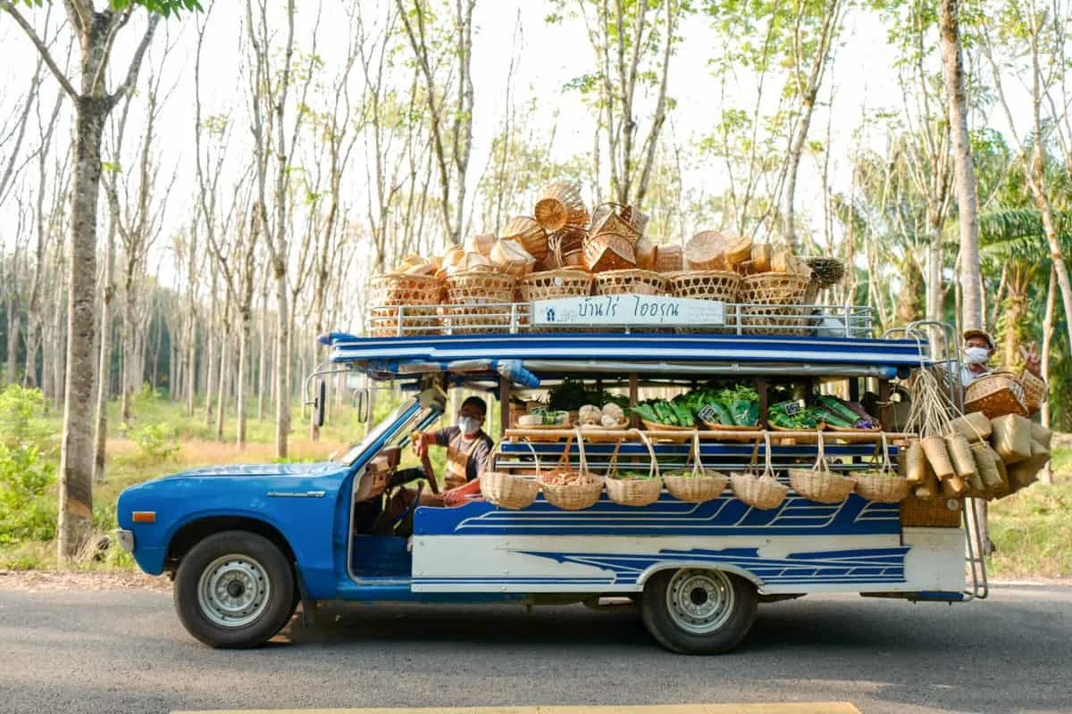 มาถึงรถพุ่มพวงที่สวยที่สุดในเมืองไทยตอนนี้ของบ้านไร่ ไออรุณ ซึ่งคุณเบสเจ้าของฟาร์มสเตย์สุดอบอุ่นแห่งจังหวัดระนองได้คิดทำขึ้นเมื่อเร็วๆ นี้ เนื่องจากทางจังหวัดได้มีการล็อกดาวน์จากการระบาดของโควิด-19 ระลอกสองที่ผ่านมา ทำให้ทางฟาร์มขาดรายได้จากนักท่องเที่ยว คุณเบสจึงนำผักออร์แกนิกที่ปลูกในไร่ออกขายให้ลูกค้าถึงที่ซะเลย โดยใช้รถกระบะเก่าของทางไร่นำมาปรับปรุงเป็นรถพุ่มพวงสีฟ้า-ขาวสบายตา พร้อมราวไม้ไผ่ไว้แขวนตะกร้าสานใส่ผักสีเขียวห่อใบตอง ผลไม้สีต่างๆ หลากหลายดูสดชื่นน่านำไปรับประทาน ทั้งยังนำกระบุง ตะกร้าสาน ใส่บนหลังคารถเพื่อให้ผู้ที่มาอุดหนุนได้ซื้อตะกร้าใส่ผักกลับบ้านโดยไม่ต้องใช้ถุงพลาสติกแต่อย่างใด