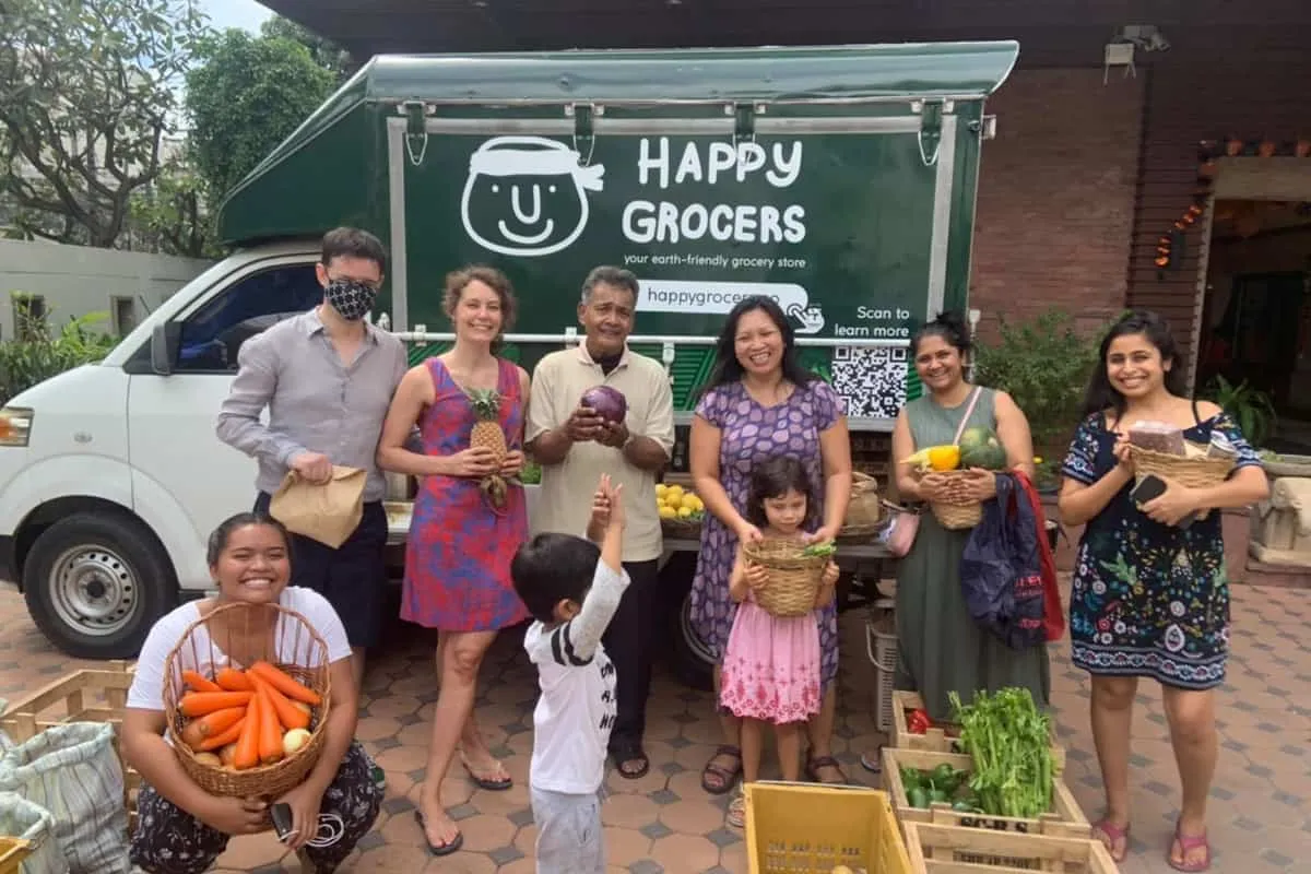 ที่กรุงเทพฯ ตอนนี้มี Happy Grocers เป็นแพลตฟอร์มจำหน่ายวัตถุดิบเกษตรอินทรีย์ส่งตรงถึงบ้านและที่ทำงาน ที่ผู้ซื้อสามารถตรวจสอบที่มาที่ไปได้ ก่อตั้งโดยสองสาวเพื่อนร่วมรั้วธรรมศาสตร์ภาคอินเตอร์ฯ ซึ่งมีภูมิลำเนาเดิมอยู่ต่างจังหวัด และยังรู้จักคุ้นเคยกับเกษตรกรเป็นอย่างดี ทั้งคู่ได้ก่อตั้งสตาร์ตอัพนี้ขึ้นมาเมื่อเดือนมีนาคมปีที่แล้ว เพื่อช่วยเหลือเกษตรกรที่ประสบปัญหาจากสถานการณ์โควิด-19 ให้มีช่องทางจำหน่ายผลผลิตได้ในราคาที่ไม่ถูกเอาเปรียบ และเพื่อให้เพื่อนๆ ผู้บริโภคชาว Expat ที่ต้องการหาซื้อวัตถุดิบออร์แกนิกแต่ไม่ต้องการจ่ายในราคาที่สูงเกินไป และอยากหลีกเลี่ยงการมีพลาสติกห่อหุ้มของผลผลิตออร์แกนิก ที่วางขายตามซูเปอร์มาร์เก็ตในเมือง
