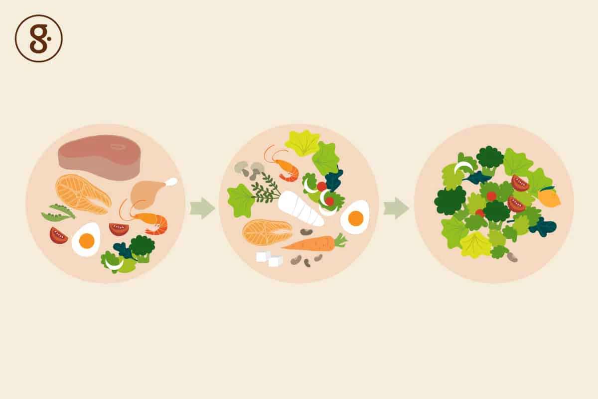 เลิกกินสัตว์ใหญ่ก่อน หากไม่รู้ว่าจะเริ่มงดเนื้อสัตว์อะไรเป็นอันดับแรก ลองเริ่มที่การตัดเนื้อสัตว์ใหญ่อย่าง วัว ออกไปก่อน จากนั้นค่อยงดเนื้อหมู แกะ หรือสัตว์ที่มีขนาดเล็กลงมาเรื่อยๆ เช่น ไก่ ปลา จนร่างกายและจิตใจเริ่มชินทำให้เราลด ละ เลิก กินเนื้อสัตว์ทั้งหมดไปได้เอง