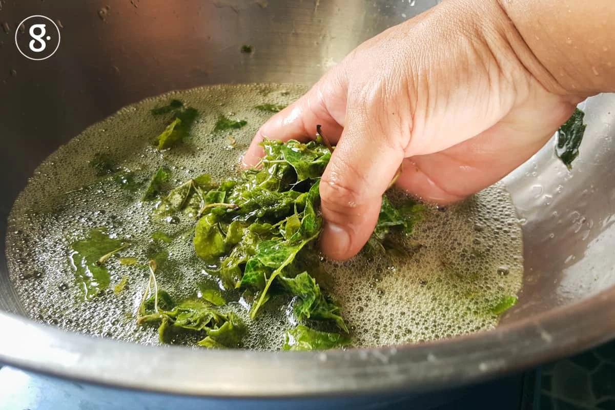 ขยำใบหมาน้อย ใบย่านาง กับน้ำสะอาดด้วยมือที่ล้างสะอาด หรือสวมถุงมือ (หากสวมถุงมือจะไม่สามารถสัมผัสความเข้มข้นกับเมือกลื่นที่เกิดขึ้นได้ และทำให้เกิดขยะหลังจากใช้เสร็จ) จนเกิดเมือกลื่นสีเขียวข้น และใบพืชเหลือเพียงกากเส้นใบสีขาว