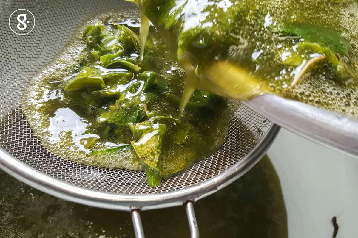 กรองเอาแต่น้ำ รินใส่ภาชนะ ใส่ตู้เย็นพักให้เซตตัว (ประมาณ 4 ชั่วโมง) คุณก็จะได้วุ้นใบหมาน้อย สีเขียวเข้ม ที่มีเนื้อสัมผัสเด้งดึ๋ง ไว้ปรุงขนมที่มีฤทธิ์เย็น เพื่อช่วยคลายร้อนกันแล้ว