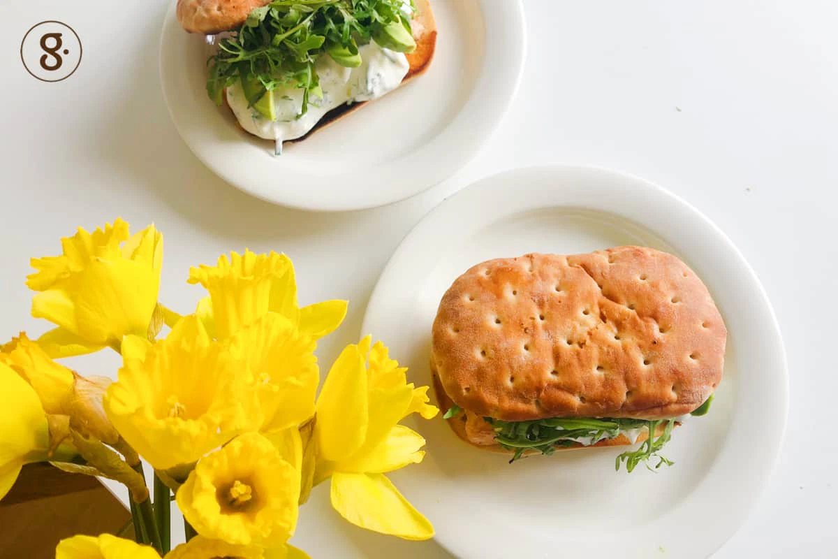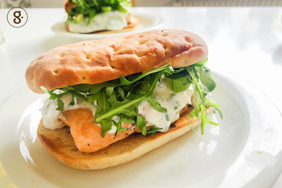 แซนด์วิชปลาแซลมอนกับซอสโยเกิร์ตสมุนไพร