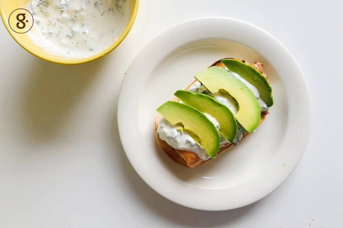 4. ประกอบร่างด้วยการวางปลาแซลมอนบนขนมปัง ราดซอสโยเกิร์สสมุนไพรบนเนื้อปลา ปิดทับด้วยอโวคาโด หรือผักสลัด และนำขนมปังอีกแผ่นมาประกบปิดด้านบน
