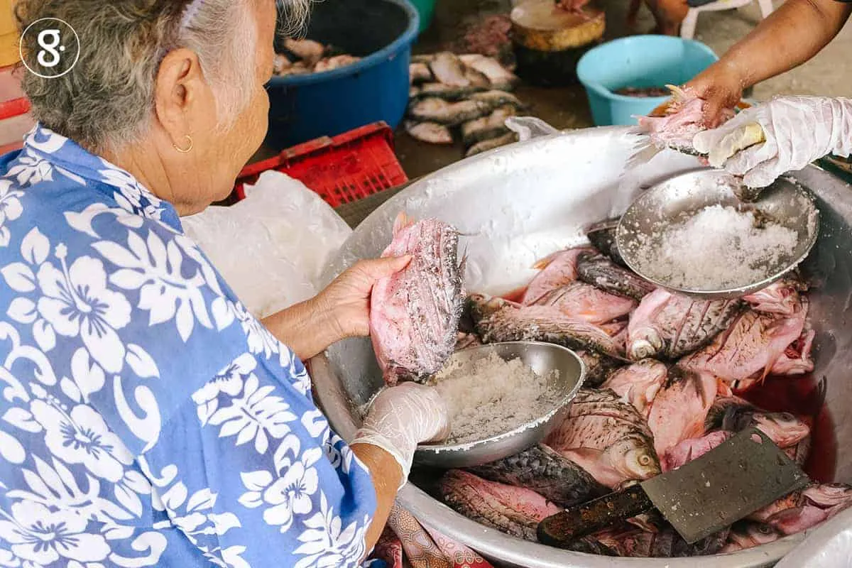 คุณยายประมวลเลือกใช้ปลาตะเพียนทำปลาส้มเพราะเนื้อมัน มีรสชาติอร่อย แม้จะก้างเยอะไปสักนิด แต่เมื่อทำให้เปรี้ยวแล้ว สามารถแล่เนื้อทอดกรอบจนกินได้ทั้งก้าง เมื่อทำความสะอาดปลาเรียบร้อยแล้วให้ทาเกลือจนทั่วตัวปลา ทิ้งไว้ครึ่งชั่วโมงจึงล้างออก เพื่อให้เกลือช่วยเก็บรักษาความสดของเนื้อปลา ขั้นตอนนี้สำคัญมาก หากทาไม่ทั่วโดยเฉพาะในซอกเหงือกปลาจะทำให้ปลาส้มเน่าได้ เมื่อล้างเกลือออกแล้วจึงนำมาหมักกับข้าวและกระเทียม ทิ้งไว้สองวันให้เปรี้ยวแล้วค่อยนำไปขาย ปลาส้มของยายประมวลอร่อยมาก (ฉันชอบแบบเปรี้ยว 4 วัน) ที่สำคัญคือเปรี้ยวจากข้าวหมักจริงๆ ไม่ใช่จากดินประสิว สะใภ้แดนอีสานที่แต่งงานอยู่ต่างแดนและชาวต่างชาติหลายคนก็สั่งไปกินไปขายอยู่บ่อยๆ ทั้งญี่ปุ่น อเมริกา สวีเดน เป็นปลาส้มที่อินเตอร์มากๆ ใครสนใจอยากชิมก็ไปหาซื้อกันได้ในตลาดสดบ้านไผ่ มีบริการส่งให้คนที่อยู่ต่างจังหวัดด้วย ราคากิโลกรัมละ 150 บาท เมนูปลาส้มตามแบบชาวบ้านไผ่นั้น คุณยายแนะนำให้นึ่งเหมือนปลานึ่ง (ที่ไม่ต้องใส่บ๊วย) หรือห่อใบตองย่างไฟก็ได้อรรถรสไปอีกแบบ