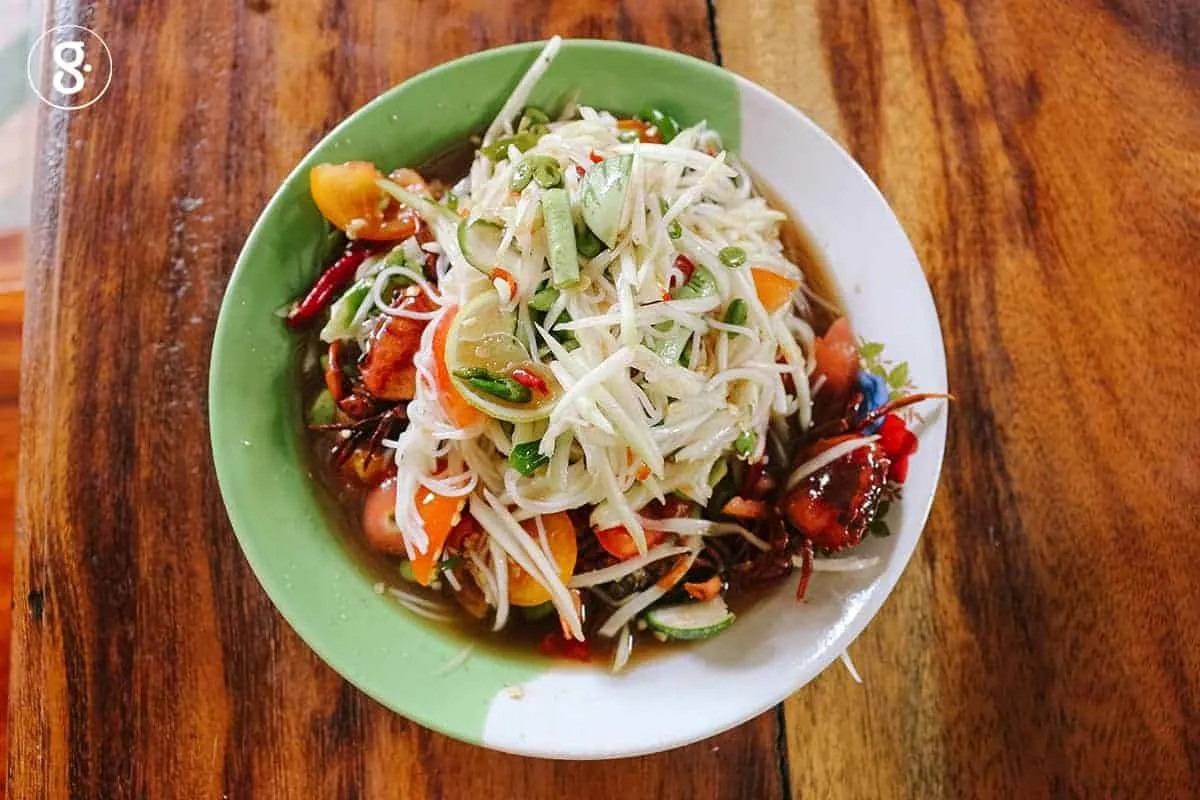 อีก ‘เส้น’ ที่ว่าคือขนมจีน ความน่าตื่นตาตื่นใจอย่างหนึ่งของบ้านไผ่คือมีร้านขนมจีนร้านเล็กร้านน้อยขายอยู่ทั่วทุกหัวระแหง แม้จะเป็นแค่ตรอกซอกซอยเล็กแคบก็ตาม ขนมจีนของชาวบ้านไผ่มีสองน้ำคือขนมจีนน้ำยาไก่ รสชาติคล้ายแกงไก่แบบเจือจาง ใส่เลือดไก่ และสารพันชิ้นส่วนของไก่สับ กินกับผัดสดเยอะๆ อีกแบบคือขนมจีนน้ำยาป่าเป็นน้ำแกงที่ไม่ใส่กะทิเค็มนัวด้วยน้ำปลาร้า ของแซ่บของดีคือส้มตำใส่เส้นขนมจีน ปรุงได้ทั้งตำไทย ตำปลาร้า ฉันไปชิมส้มตำร้านหนึ่งใกล้วัดมงคลหลวง (ไม่มีชื่อร้าน) ป้าคนขายบอกว่าคนที่นี่เรียกส้มตำใส่เส้นขนมจีนว่า ซกเล็ก รสชาติอร่อยจัดจ้านตามสไตล์ชาวอีสานจนต้องแนมหมูสามชั้นทอดกรอบไปเสียหลายถุง (ฮ่า) จะว่าไป คำว่าซกเล็กนั้นก็ชวนให้เรามึนงงและสับสนกับซกเล็กที่เป็นลาบเนื้อดิบใส่เลือดและดีอยู่ไม่น้อย