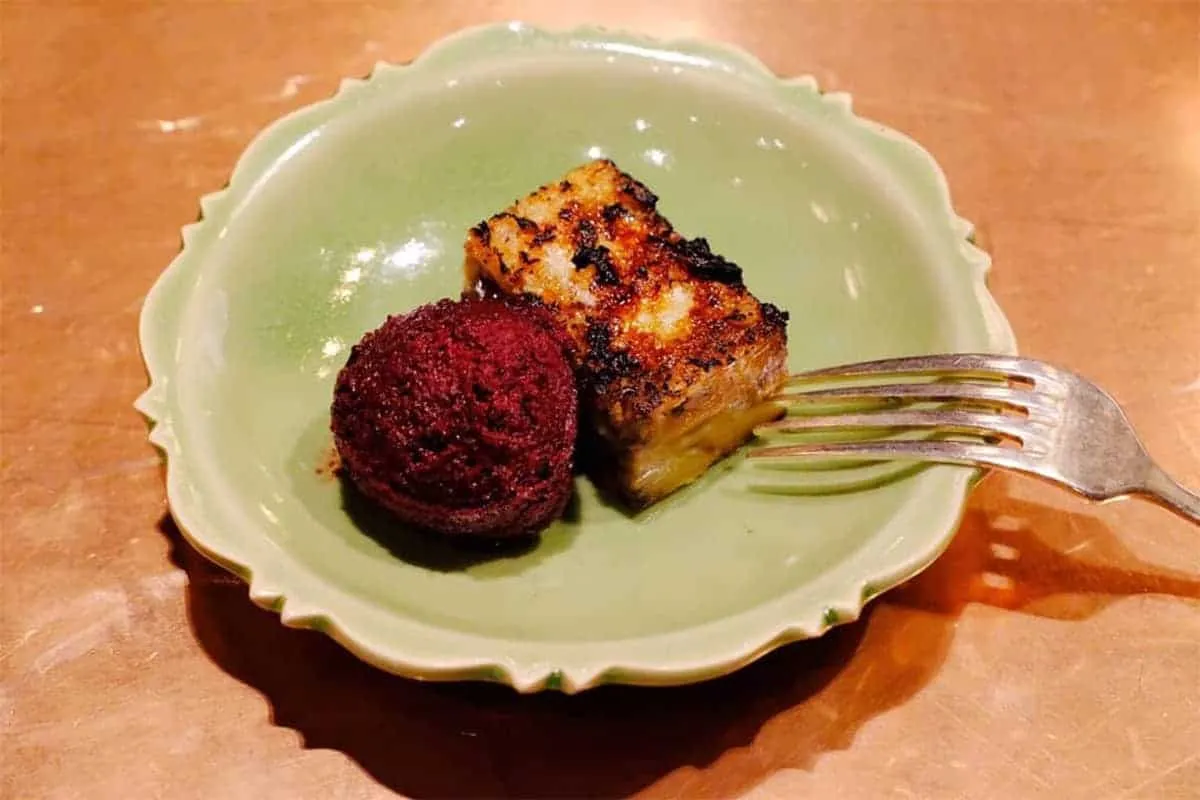 น้ำพริกปลาป่นหมาล่า ผมกับเชฟเจษทำน้ำพริกปลาป่นที่ได้เนื้อปลาจากหน้าและไส้ของซูชิ ทั้งปลาแซลมอน ทูน่า และฮามาจิ เพิ่มเติมด้วยปลาแซลมอนย่างเกลือที่เลาะๆ เนื้อมา นำทั้งหมดมาคั่วกับพริกหมาล่าที่เหลือจากงานบาร์บีคิว ใส่เครื่องหอมตามที่มี และให้กินกับแอปเปิ้ลเขียวกรอบๆ เย็นๆ