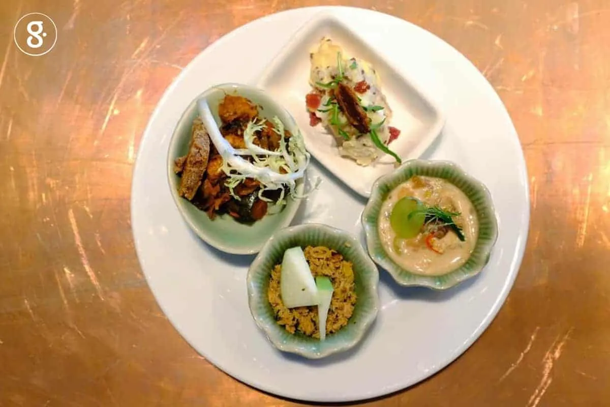 แกงคั่วสับปะรดหมูกรอบ แกงคั่วที่เชฟหนุ่มและเชฟชาลี ตำเครื่องแกงขึ้นมาใหม่ แกงกับสับปะรดที่เหลือมากมายและหมูกรอบจากบุฟเฟ่ต์ในโซนอาหารจีน มาจัดเรียงเป็นคำๆ เป็นคานาเป้รสจัดจ้าน