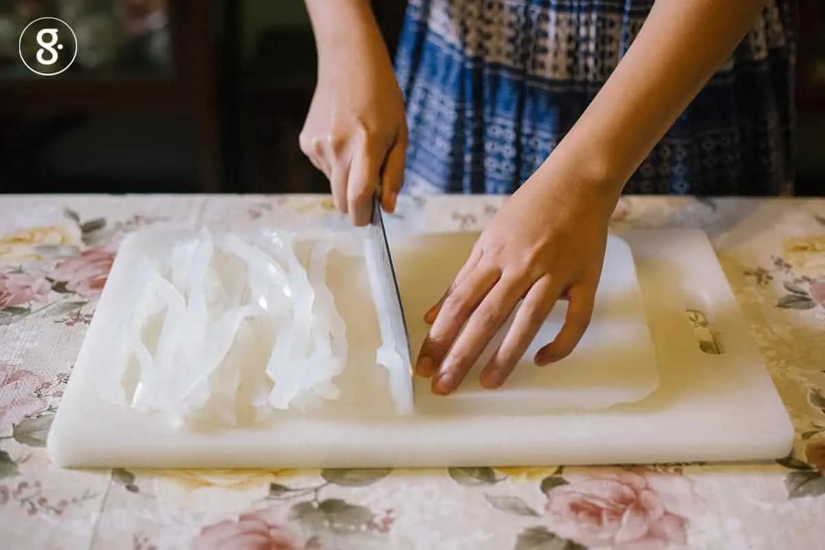 2. หั่นเส้นขนาดเล็กใหญ่ตามชอบ เลือกได้ตั้งแต่การใช้ที่ขูดขูดเป็นเส้นไม่สม่ำเสมอคล้ายเกี้ยมอี๋ ไปจนถึงเส้นเล็ก เส้นใหญ่ หรือก้อนหนาเหมือนขนมหัวผักกาดก็ได้