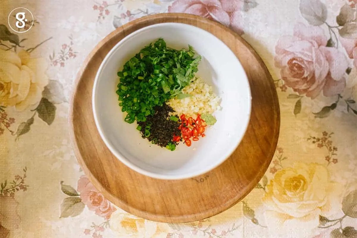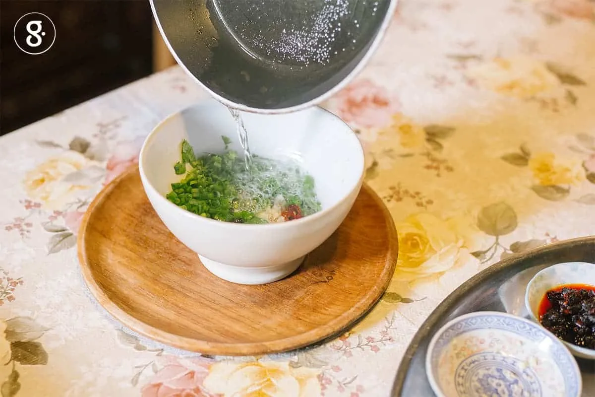 3. น้ำมันตั้งกระทะพอร้อน (ไม่ต้องรอให้เดือดขึ้นควัน) เทใส่ชามที่มีเต้าซี่ กระเทียมจีนสับ พริก ต้นหอม ผักชีซอย ให้น้ำมันทำให้วัตถุดิบมีกลิ่นรสชัดเจน ไม่สุกจนเกินไป และสีสันยังคงสวยงาม