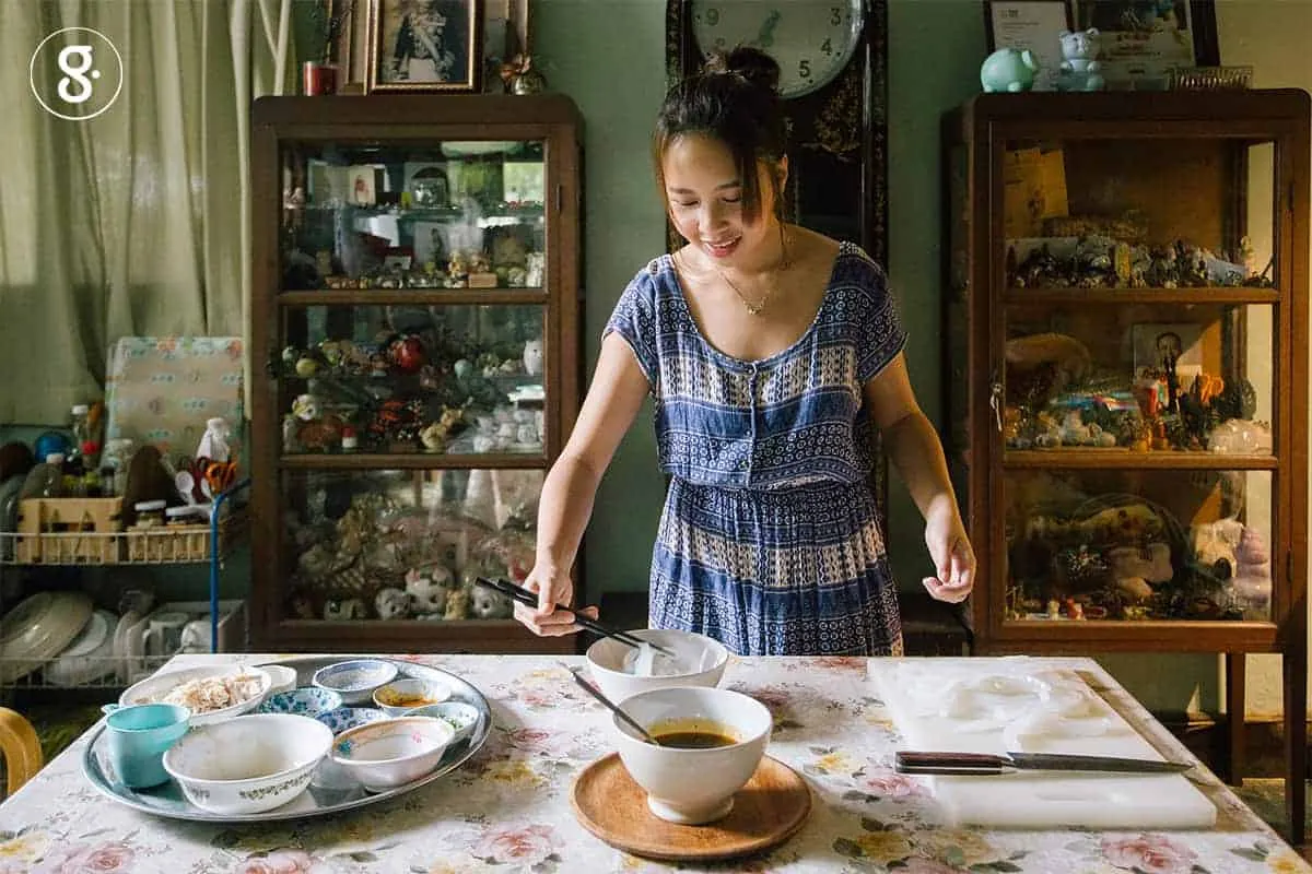 หญิงสาวเล่าถึงความฝันที่มีต่ออาหารแต่ถูกหมักบ่มอยู่นานหลายปี ไปพร้อมๆ กับการหั่นซอยเส้นจากแป้งถั่วเขียว เธออธิบายถึงวิธีทำอย่างคล่องแคล่ว เริ่มจากนำแป้งถั่วเขียว (แบบเดียวกับที่ใช้ทำซาหริ่มละลายกับน้ำพักไว้ จากนั้น ก็มาต้มน้ำพอร้อน เติมแป้งละลายแล้วกวนจนใส เทใส่ถาดแล้วรอให้เย็นและแข็งเป็นวุ้นใส แล้วค่อยนำมาตัดตามขนาดเล็กใหญ่อย่างที่ชอบ หรือบางบ้านอาจจะเลือกวิธีขูดให้เป็นเส้นเล็กๆ ก็ได้