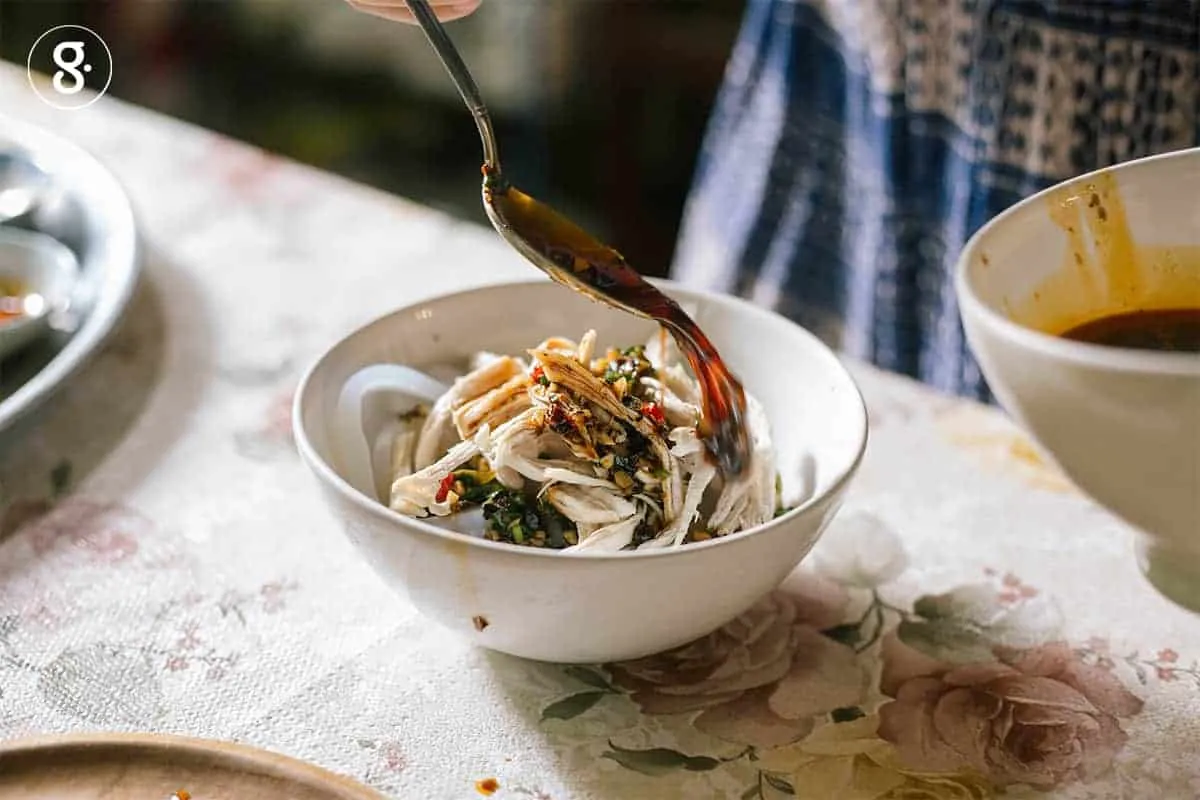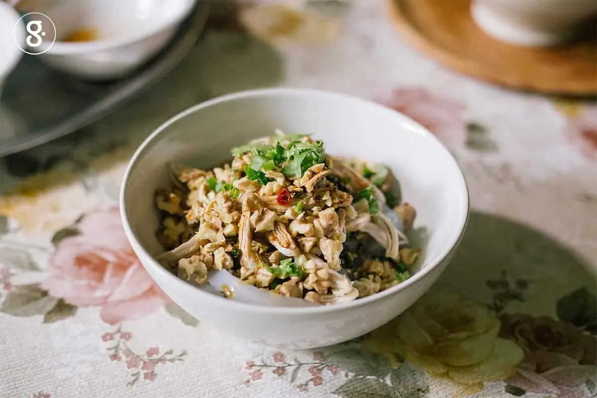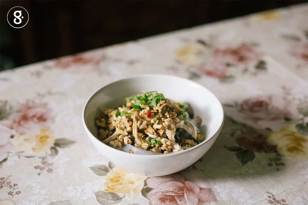 4. คนส่วนผสมซอสที่เหลือเข้าด้วยกัน ตักเส้นใส่ชาม ราดด้วยซอส โปะไก่สับ โรยหน้าด้วยวอลนัทตามชอบใจ คลุกเคล้าให้เข้ากันก่อนกิน