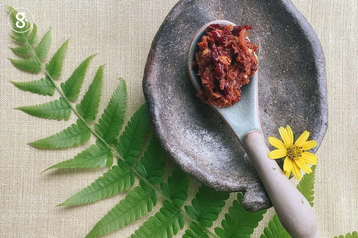 ตำน้ำพริกง่ายๆ ใช้พริกแห้ง กระเทียม หัวหอม เกลือ ตำให้ละเอียด แล้วใส่กะปิลงไปหน่อย บางคนใส่ปลาร้าด้วย แต่สำหรับฉัน กะปิอย่างเดียวก็เหลือจะพอ