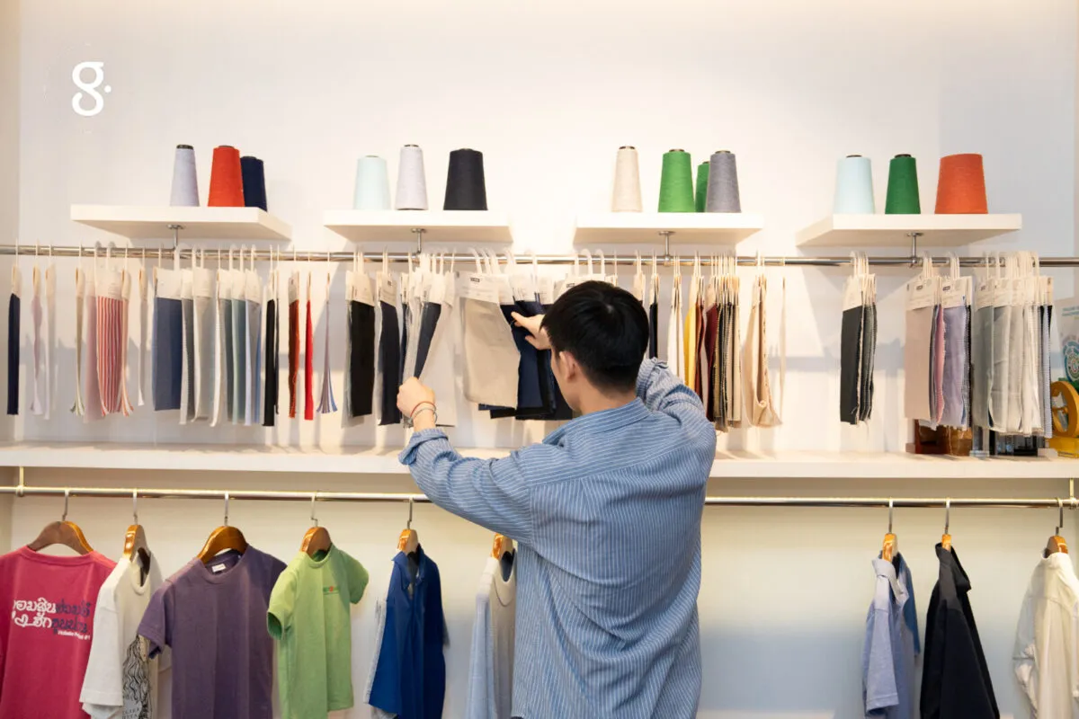 “ถ้ามองเสื้อและกางเกงยีนส์ที่ผมใส่วันนี้ หรือผ้าที่อยู่ที่นี่ทั้งหมด ผ้าเหล่านี้เป็นผ้าที่เรียกว่า ‘Undyed Fabric’ หรือว่าผ้าที่ไม่ผ่านกระบวนการฟอกย้อม ซึ่งเราใช้เศษด้าย เศษผ้า และเสื้อผ้า รวมทั้งไฟเบอร์เป็นวัตถุดิบหลัก คือในกระบวนการผลิตผ้าจากฝ้ายทั่วไปจะเริ่มต้นจาก การปลูกและเก็บเกี่ยวฝ้าย > การเตรียมเส้นใย > การทำเส้นด้าย > การทอผ้า > ฟอกย้อม > และจบที่การตัดและเย็บ วิธีทำงานของ CIRCULAR ต่างออกไปในแง่ที่ว่า เราสามารถลดทอนขั้นตอนให้เหลือเพียง การทำเส้นด้าย > การทอผ้า > การตัดและเย็บ ซึ่งจะลดขั้นตอนการปลูกฝ้ายและฟอกย้อมไป