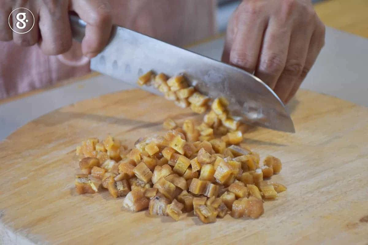 1. นำกล้วยตากมาหั่นเต๋าขนาดประมาณครึ่งเซนติเมตรกำลังพอดีนะคะ หากชิ้นใหญ่เกินไปจะทำให้เนื้อขนมรับน้ำหนักไม่ไหว ขนมอาจไม่ขึ้นฟูเท่าที่ควรค่ะ
