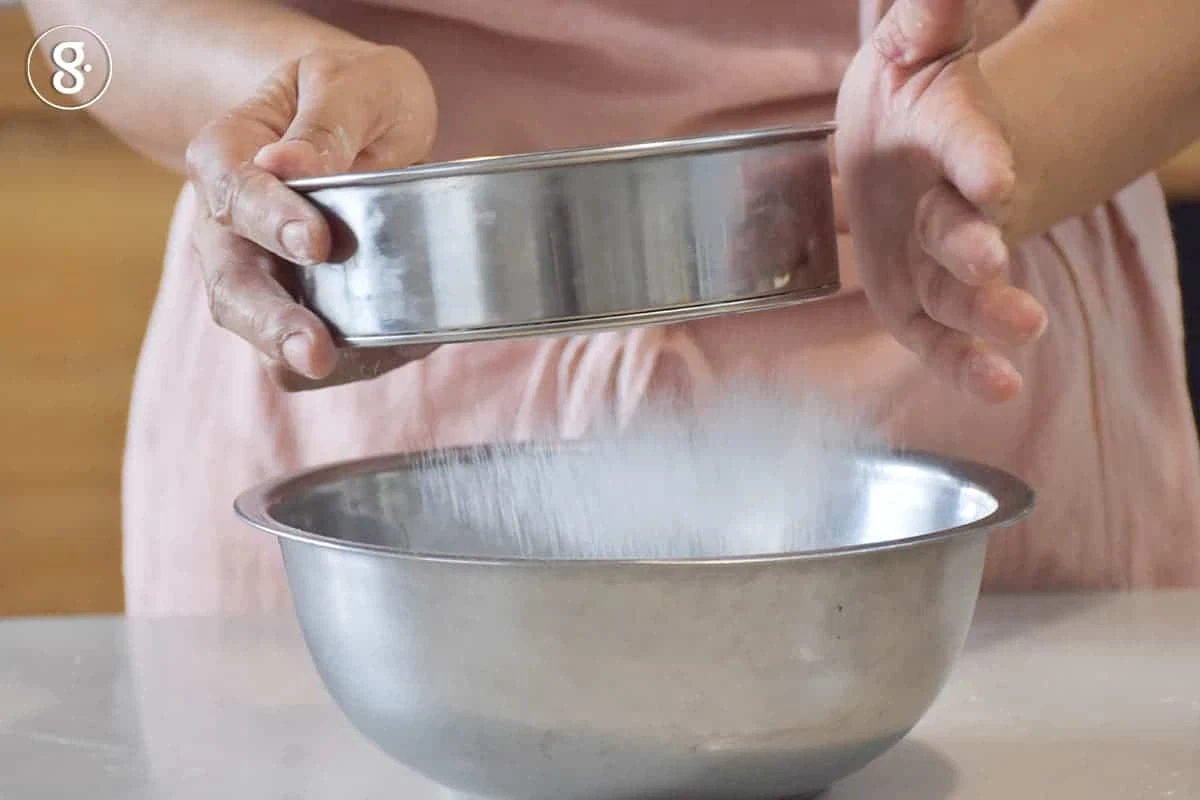2. ชามส่วนผสมของแห้ง เราจะร่อนผสม ได้แก่ แป้งข้าวหอมมะลิออร์แกนิก เบกกิ้งโซดา ครั้งเดียวพอนะคะ
