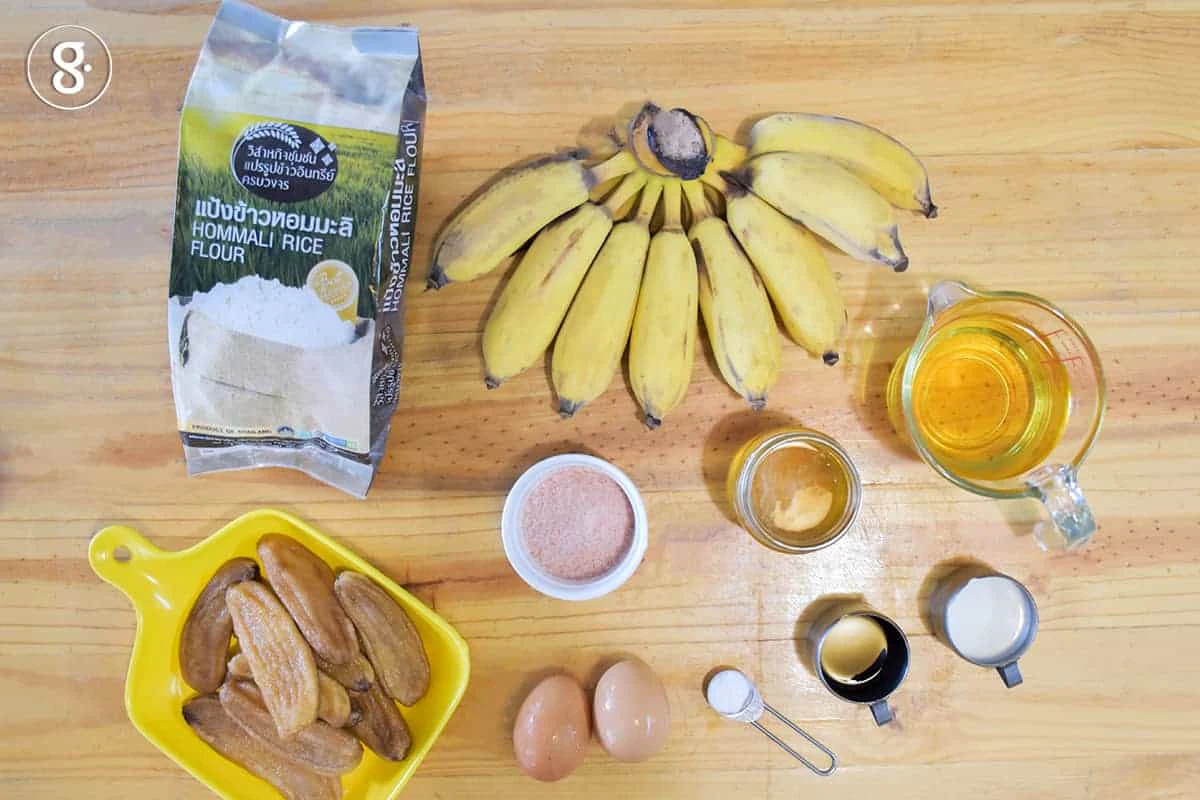 ครั้งนี้ก็เลยได้ทีขอชวนคุณผู้อ่านมาทำมัฟฟินขนมฝรั่งแต่ใช้วัตถุดิบท้องถิ่นที่หาได้ทั่วไปอย่างกล้วยตากกัน แถมยังป็นมัฟฟินแบบกลูเตนฟรีด้วยนะคะเพราะเราจะใช้แป้งข้าวมะลิออร์แกนิกแทนการใช้แป้งสาลี น่าจะถูกใจและเป็นทางเลือกให้กับท่านที่แพ้กลูเตน และคุณแม่ ๆ เองก็สามารถทำเมนูง่าย ๆ นี้ให้กับคุณลูก ๆ ที่แพ้กลูเตนได้เช่นกันค่ะ ว่าแล้วมาดูส่วนผสมกันเลย