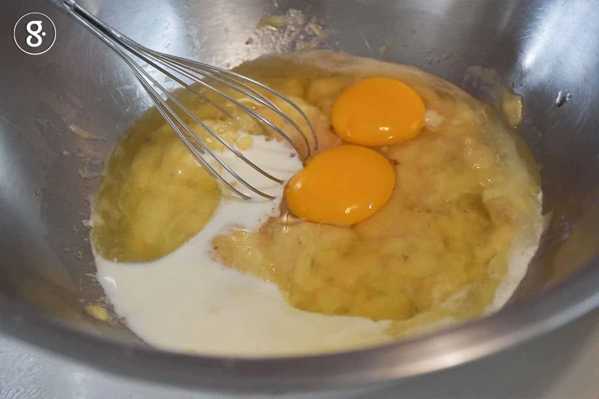 3. ชามส่วนผสมของเปียก เราจะเริ่มด้วยการ บดกล้วยน้ำว้าให้พอละเอียดค่ะ อาจให้เป็นเนื้อของกล้วยอยู่ด้วยได้ เพื่อเพิ่มเนื้อสัมผัสของมัฟฟิน จากนั้นใส่เกลือสินเธาว์ นมสด น้ำผึ้ง ไข่ไก่ ใช้ตะกร้อมือดีให้ส่วนผสมเข้ากันดี ตามด้วยน้ำมันรำข้าวและกลิ่นวานิลลา ตีต่อให้ส่วนผสมรวมเป็นเนื้อเดียวกันดีค่ะ