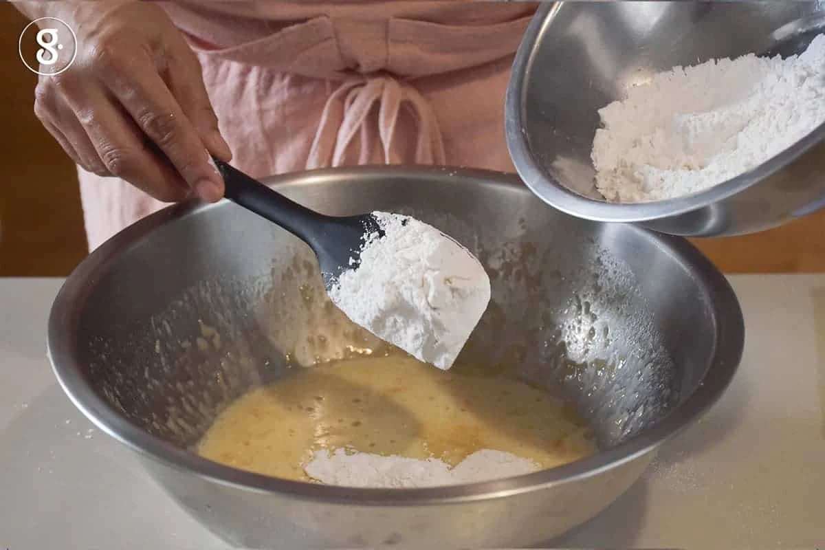 4. เทส่วนผสมของแห้งลงในชามส่วนผสมของเปียก แบ่งใส่ 3 ครั้ง คนให้ส่วนผสมให้เข้ากัน
