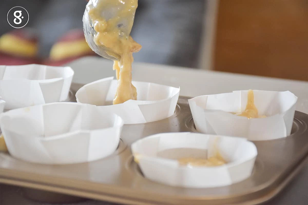 ตักส่วนผสมใส่พิมพ์มัฟฟิน (พิมพ์คัปเค้ก) ให้ต่ำกว่าขอบพิมพ์ครึ่งเซนติเมตรเวลาอบขนมจะขึ้นสวยพอดีค่ะ