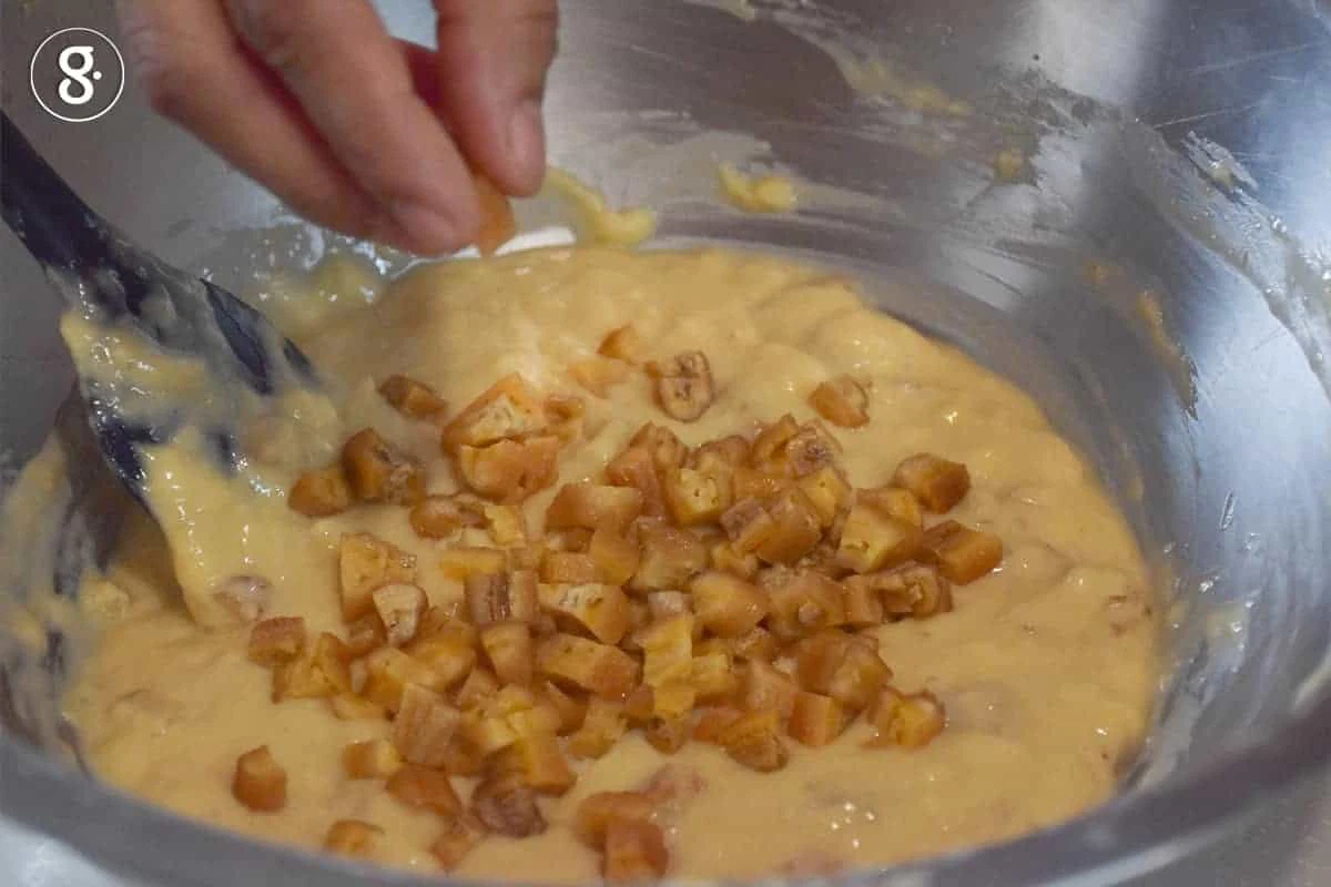 5. ขั้นตอนสุดท้ายนะคะ เราจะใส่กล้วยตากที่หั่นเต๋าไว้แล้ว ใช้พายคนให้กระจายทั่วกัน