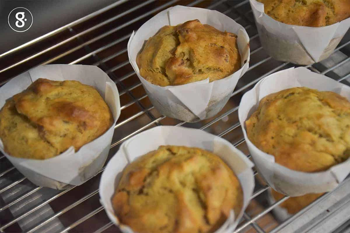 2. ควรอบขนมแต่พอสุก สามารถสังเกตได้โดยการใช้ไม้ปลายแหลมจิ้มไปที่ตรงกลางของขนม หากไม่มีเนื้อเค้กติดขึ้นมากับไม้แสดงว่าสุก ถ้าอบนานเกินจะทำให้เนื้อมัฟฟินหยาบแห้งและมีผิวหน้าที่แข็ง