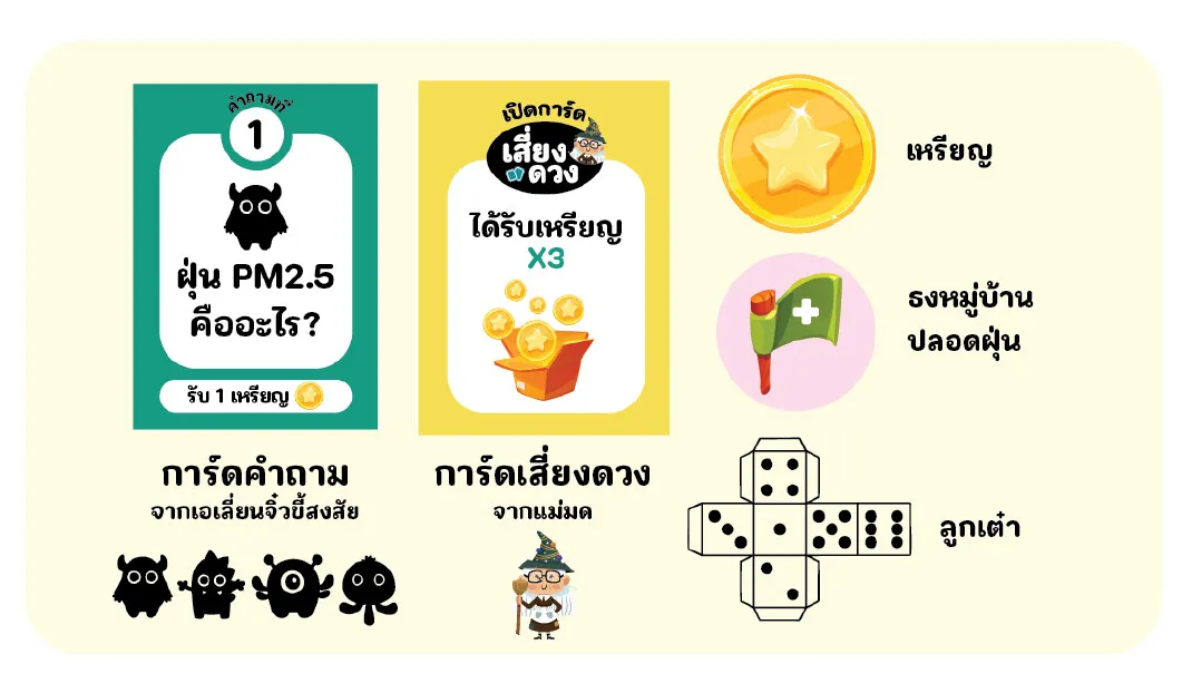 ตัวเกมยังผูกโยงเนื้อหาความรู้เรื่องฝุ่น PM2.5 เข้าไว้กับการเล่นได้อย่างแนบเนียน ไม่ว่าจะเป็นสาเหตุการเกิดฝุ่นจากกิจกรรมในบ้าน การเดินทาง (คมนาคม-ขนส่ง) การกำจัดขยะ ไปจนปัญหาต่าง ๆ ที่ส่งผลกระทบต่อสุขภาพและคุณภาพชีวิต ภายในเกมอาจไม่ได้บอกตรง ๆ ว่าฝุ่นเป็นอันตรายอย่างไร แต่จะทำให้ผู้เล่นได้เรียนรู้ด้วยตัวเองในมิติและสถานการณ์จำลองต่าง ๆ ที่ส่งผลกระทบกลับมายังชุมชนและตัวเรา ทำให้เกิดความเข้าใจอย่างเป็นธรรมชาติมากกว่าการท่องจำเพียงอย่างเดียว นอกจากนี้การเล่นเกมยังฝึกให้เด็ก ๆ ได้พูดคุย สนทนา ปรึกษากัน ฝึกวางแผน ฝึกยอมรับความคิดเห็น ฝึกแลกเปลี่ยนเรียนรู้ ฝึกการช่วยเหลือ ตลอดจนเข้าใจภาพรวมเดียวกันด้วย ที่สำคัญยังสามารถนำความรู้เหล่านี้ไปประยุกต์ใช้กับชีวิตจริงได้ในทันที ชัยชนะในเกมอาจสร้างความภาคภูมิใจได้ชั่วครู่ แต่เราเชื่อมั่นว่าสิ่งนี้จะเป็นสารตั้งต้นให้เป็นเกราะป้องกันชั้นดีให้อนาคตของชาติสามารถรวมกันเอาชนะมลพิษทางอากาศในโลกแห่งความเป็นจริงให้ได้ในอนาคตด้วยเช่นกัน