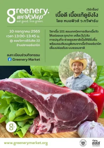 #GreeneryWorkshop ถึงเนื้อคู่ยังมองไม่เห็น แต่ถ้าอยากกินเนื้อดีๆ ต้องดูให้เป็น คนรักเนื้อห้ามพลาด!!! เพราะเราจะสอนเทคนิคการดูเนื้อวัวให้เป็นเนื้อส่วนไหนดี ส่วนไหนเด็ด บอกหมดไม่มีกั๊ก แถมทีเด็ดด้วยเมนูพิเศษจากเนื้อวัวออร์แกนิกเลี้ยงปล่อยในระบบธรรมชาติ ถ้าใครติดใจในรสชาติเนื้อเน้นๆ แบบนี้สามารถซื้อกลับบ้านได้เลย