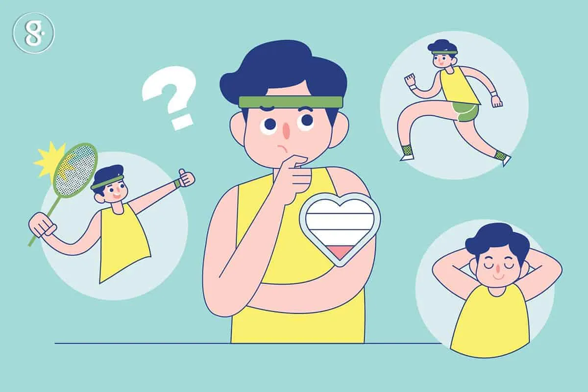 - ถ้าเรารู้สึกเฉย ๆ เมื่อยเล็กน้อย ก็ออกกำลังกายได้ปกติ ก็ประเมินตามสภาพ ให้อยู่ในช่วง 7 – 3 คะแนน ก็ให้ออกกำลังกายที่ระดับปานกลาง เช่น ยกน้ำหนักให้เบาลง จำนวนเซ็ตน้อยลง จำนวนท่าน้อยลง หรือวิ่งให้ช้าลง ลดระยะทางลง