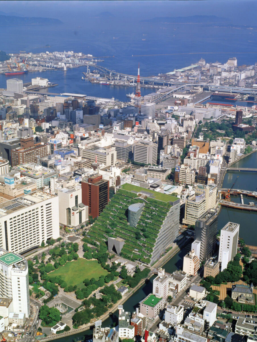 ผลงานโดดเด่นที่สุดจนทำให้ AquaSoil เป็นที่รู้จักในระดับนานาชาติและกลายเป็น Case Study สำคัญระดับสากลที่จดจำได้ทั่วโลกนั้นก็คือ ACROS Fukuoka (Asian Cross-Road Over the Sea – Fukuoka) ซึ่งเป็นอาคารศูนย์รวมกิจกรรมนานาชาติแห่งเมืองฟุกุโอกะ ประเทศญี่ปุ่น สร้างขึ้นในปี 1995 ออกแบบโดย Emilio Ambasz สถาปนิกชาวอาร์เจนตินา-อเมริกัน หนึ่งในผู้บุกเบิก Green Architecture คนสำคัญของโลก สถาปัตยกรรมนี้เป็นอาคาร 14 ชั้นสร้างขึ้นภายใต้แนวคิด “ตึกกลางเมืองที่เป็นมิตรกับสิ่งแวดล้อม” ซึ่งด้านนอกที่ติดถนนจะดูเหมือนอาคารสำนักงานทั่วไปส่วนด้านในที่ติดกับสวนสาธารณะเท็นจิน (Tenjin Central Park) มีลักษณะเป็น Step Garden สวนสีเขียวแบบขั้นบันไดขนาดใหญ่ปกคลุมทั้งอาคารคล้ายกับการจำลองภูเขามาไว้กลางเมือง
