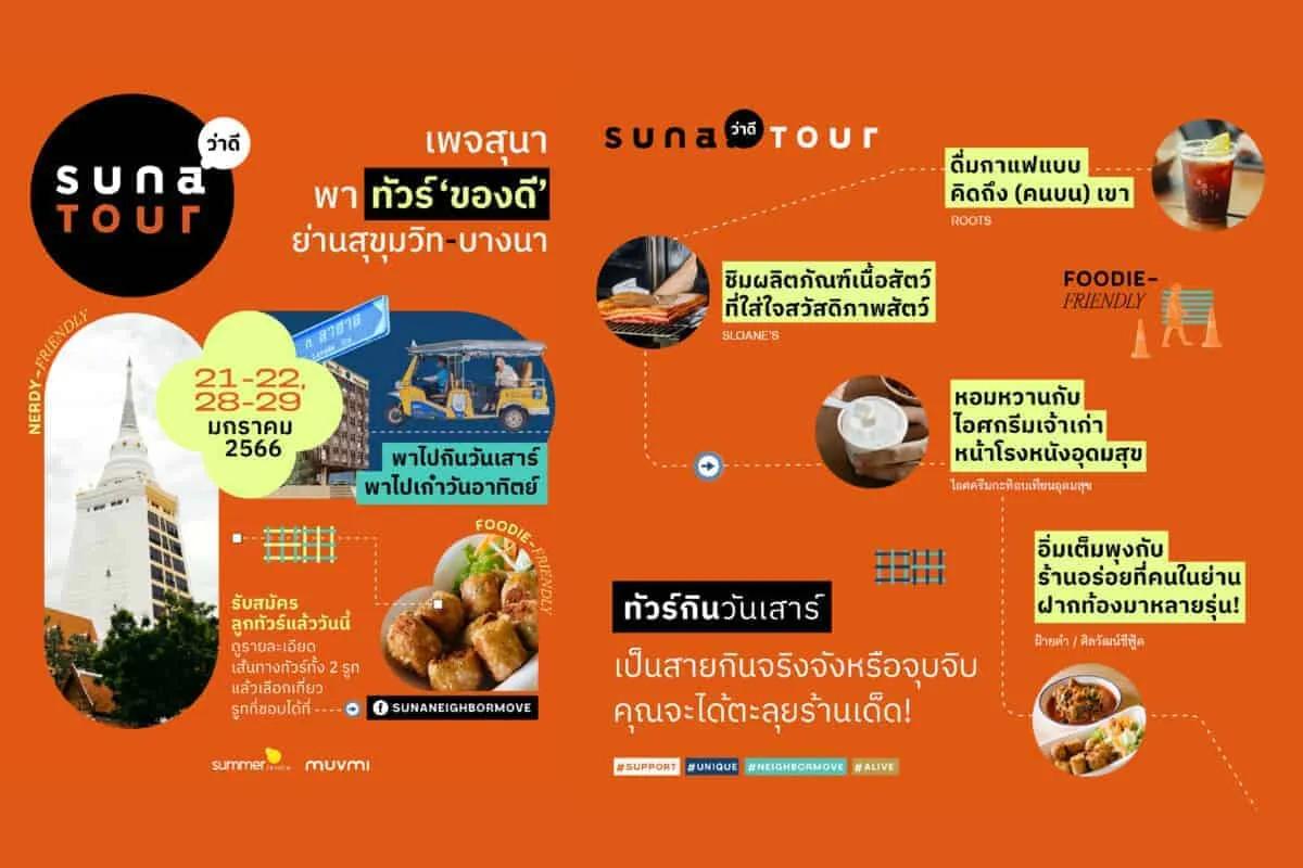 ทริปจากเพจ ‘สุนา’ ที่จะพาไปลัดเลาะย่าน ‘สุขุมวิท-บางนา’ ตามหาทั้งของอร่อยและเรื่องราวเชิงประวัติศาสต์น่าสนใจประจำย่าน ในตีม Local-Eco-Friendly ผ่านการใช้ขนส่งสาธารณะพลังงานไฟฟ้าและเดินเท้าเข้าย่าน พร้อมอุดหนุนร้านค้ารายย่อยเพื่อกระจายรายได้สู่เศรษฐกิจฐานรากให้เติบโตอย่างยั่งยืนไปด้วยกัน