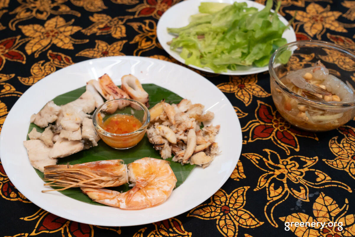 และก็มาถึงช่วงกิจกรรมไฮไลท์ คือการชิมเมนูอาหารทะเลปลอดภัยจากชาวประมงที่ทำประมงอย่างรับผิดชอบต่อสิ่งแวดล้อม จับในแหล่งน้ำสะอาด ใช้วิธีที่เหมาะสม และไม่ใส่สารเคมี ที่ทางร้านปลาออร์แกนิกได้จัดเตรียมไว้ นั่นคือเมนูปิ้ง นึ่ง ย่าง ที่มีทั้งกุ้งแชบ๊วย ปู ปลาช่อนทะเล ปลาหมึก เสิร์ฟพร้อมน้ำจิ้มซีฟู้ด พ่วงด้วยอีกเมนูคือ ส้มตำกุ้งดอง โดยผลผลิตทุกอย่างในจานที่สะท้อนผ่านเนื้อสัมผัสและรสชาติธรรมชาติของวัตถุดิบ ทำให้ผู้บริโภคอย่างเรามั่นใจได้เลยว่า สด สะอาด ปลอดภัย และดีต่อสุขภาพของเราแน่ ๆ