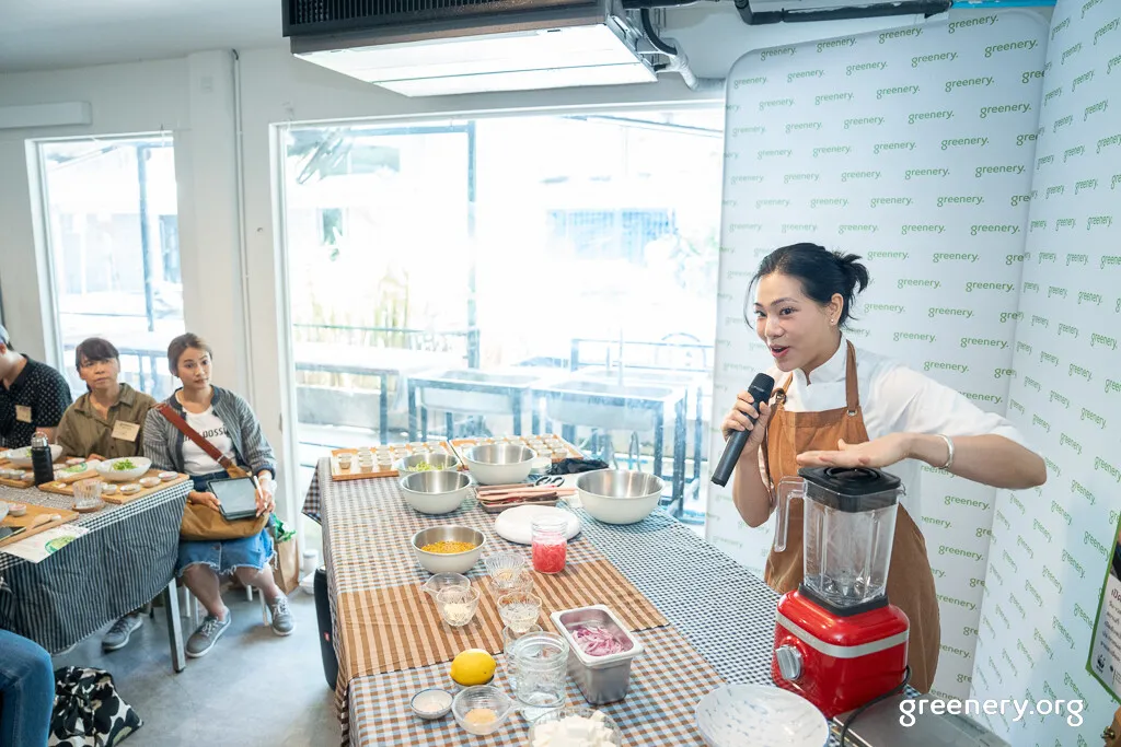 จากนั้นทุกอย่างที่เชฟสาธิต ก็ถูกเสิร์ฟอยู่ตรงหน้าผู้ร่วมกรีนทุกคน พร้อมผักสลัดกองโต และเครื่องเคียง หอมแดงดอง น้ำหอมแดงผสมยูสุ น้ำมันกุยช่าย น้ำมันมะเขือเทศ ที่มาช่วยเพิ่มกิมมิกและรสชาติที่แตกต่าง แถมยังมีดอกไม้กินได้ปลอดสาร เมล็ดทานตะวัน เมล็ดฟักทอง ถั่วพิสตาชิโอ งาขี้ม่อน ที่ช่วยเพิ่มเทกเจอร์กรุบกรอบ เรียกว่าเป็นหนึ่งมื้อที่ให้สารอาหารครบถ้วน แถมปลอดภัยต่อสุขภาพอีกด้วย