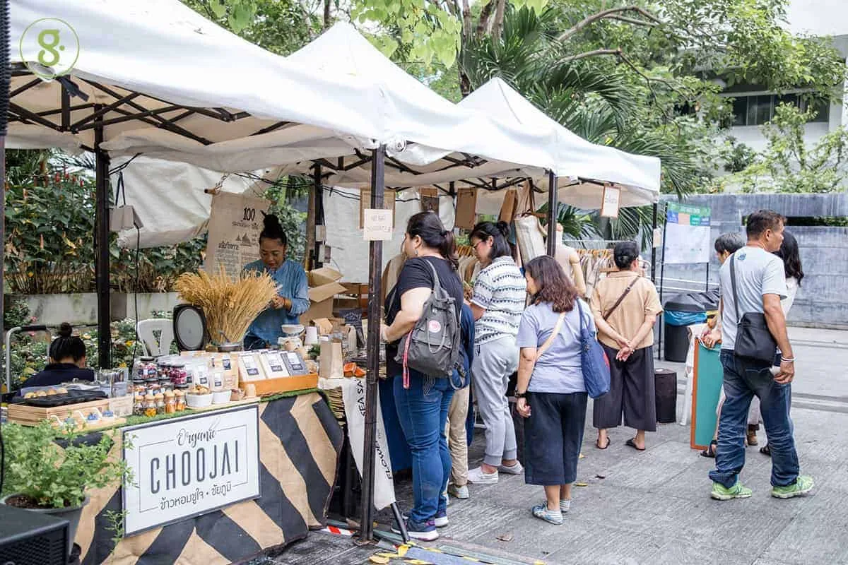 บูทของกินดีที่มีขายในตลาดหนนี้ แน่นอนว่าอุดมไปด้วยของอร่อยและดี ไม่ว่าจะเป็นพัฟย่างปั้นสดสุดยอดเมนูขายดีของบูท ‘สวนดินคานาอัน’ มะเขือเทศสดและข้าวโพดราชินีทับทิมสยามของบูท ‘ข้าวขวัญออร์แกนิก’ น้ำผักผลไม้ออร์แกนิกสกัดเย็นชื่นใจของบูท ‘Passion Food’ ต้นอ่อนผักบุ้ง น้ำสับปะรดคั้นสดส่งตรงจากเกษตรกร และขนมจีนน้ำยาเส้นแป้งสด ของบูท ‘วิสาหกิจชุมชนบ้านพระพร ราชบุรี’ แครกเกอร์ธัญพืชอบกรอบของบูท ‘Brown Rice Cracker’ กล้วยน้ำว้าสดและอบแสนอร่อยของบูท ‘ธำรงฟาร์ม’ น้ำอ้อยออร์แกนิกของบูท ‘ไร่อ้อยยิ้ม’ น้ำตาลสดจากดอกมะพร้าวแท้ 100% ของบูท ‘กำนันหนุ่ม’ น้ำฝรั่งและฝรั่งสดของบูท ‘สามพรานโมเดล’ อาหารทะเลสดๆ และแบบนึ่งของบูท ‘Fisher Folk’ ก้านเห็ดหอมปรุงรสเคี้ยวเพลินของบูท ‘Sunday’ น้ำผึ้งป่าจากแหล่งธรรมชาติจากชุมชนหินลาดในของบูทน้องใหม่อย่าง ‘Hostbeehive’ กาแฟออร์แกนิกจากเชียงดาวที่มีขายทั้งแบบเม็ด แบบดริป และโคลด์บรู ของบูท ‘ม่อนดอยหลวง ออร์แกนิก คอฟฟี่’ มะพร้าวน้ำหอมจากสามพราน ไอศกรีมโฮมเมดของบูท ‘Jinta’ ดอกเกลือจาก ‘สวนศิลป์หนองมน’ ไส้กรอกโฮมเมดจากบูท ‘N&n’ และอื่นๆ อีกมากที่บรรยายไม่หมดและไม่อร่อยเท่ามาลองกินด้วยตัวเอง