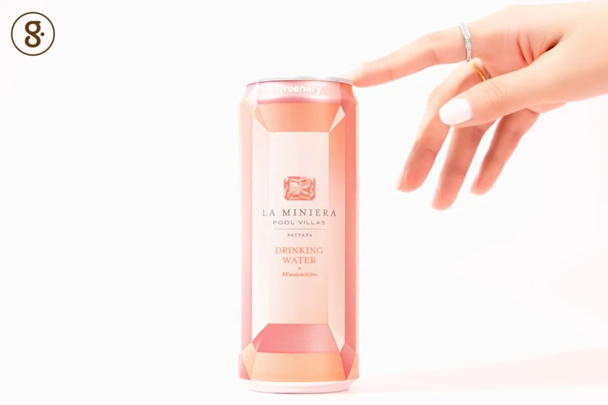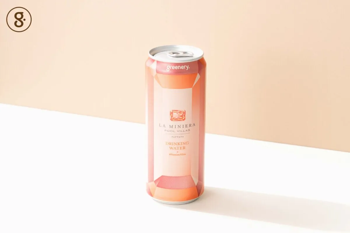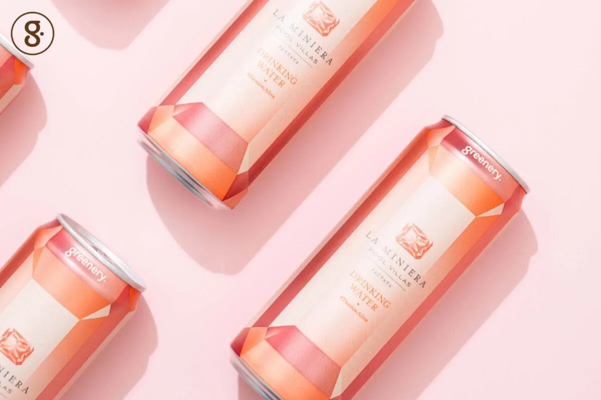 น้ำดื่มกระป๋องดีไซน์ล่าสุดที่ชนิสรเอ่ยถึง คือการสร้างสรรค์ร่วมกันของ La Miniera Pool Villas Pattaya กับ Greenery Water ที่นำมาสู่ ‘Greenery Water Special Design for La Miniera’ ออกแบบโดย สมชนะ กังวารจิตต์ Executive Creative Director แห่ง Prompt Design เมื่อได้ศึกษาถึงแนวทาง และ persona ของแบรนด์แล้ว นักออกแบบผู้คว้ารางวัลออกแบบระดับโลกกว่า 200 รางวัลคนนี้ จึงเลือกสีโรสโกลด์ซึ่งเป็น Color Identity ของแบรนด์มาใช้ดีไซน์ตัวกระป๋อง เมื่อจัดวางในห้องพัก และมุมต่าง ๆ ของโรงแรมที่มีความเป็นเมทัลลิกตัดกับวัสดุธรรมชาติอย่างไม้ ก็ทำให้ตัวบรรจุภัณฑ์มีความโดดเด่นขึ้นอย่างน่าสนใจ