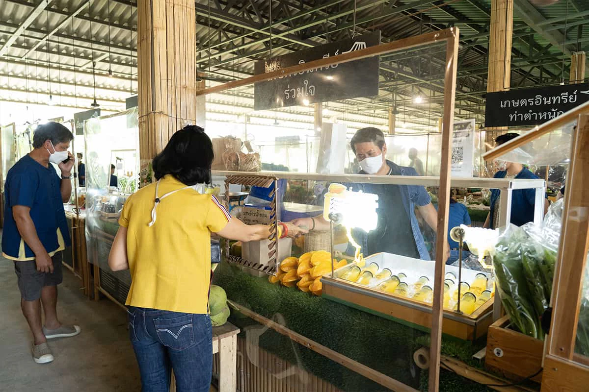 ความคุ้นชินของคนที่เดินตลาดนี้ได้เจอทุกครั้งที่ไปคือความสะอาด สบายตา ทั้งตัวตลาด ร้านค้า และแพ็กเกจจิ้งที่ทุกร้านพยายามใช้วัสดุธรรมชาติมาพัน ห่อ กลัด มัดสินค้าของตัวเอง ไม่แปลกที่นอกจากจะได้สุขใจกับของดีราคาน่ารักแล้ว เราจะยังได้สัมผัสถึงความจริงใจของตัวสินค้าเองจากการพูดคุยกับพ่อค้าแม่ค้าเกษตรกรในตลาด และถึงแม้จะมีเกษตรกรในโครงการสามพรานโมเดลมากขึ้นทุกปี แต่สิ่งที่เหมือนเดิมคือความกรีน ดังนั้นเราลูกค้าก็อย่าลืมพกถุงผ้า หิ้วตะกร้าไปตลาดด้วยล่ะ