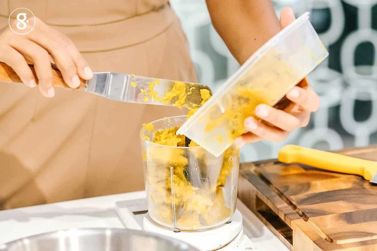 3. ใส่ฟักทองและอินทผาลัมลงโถปั่น ตามด้วยน้ำตาลมะพร้าว แล้วปั่นรวมกันจนเนื้อเนียน หากรู้สึกว่าปั่นยาก อาจเติมของเหลวช่วย เช่น น้ำเปล่า นมอัลมอนด์ นมถั่วเหลือง หรือกะทิ