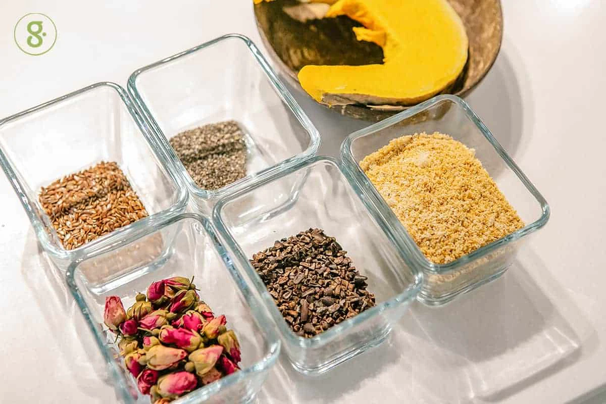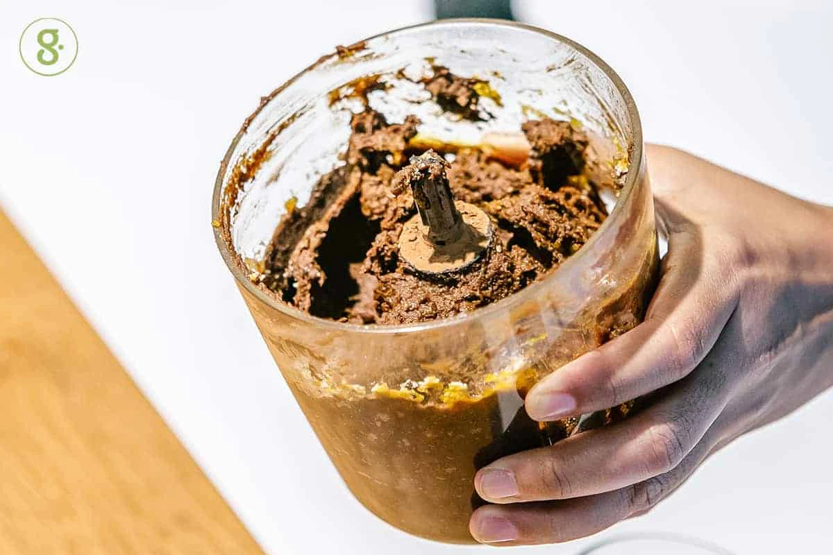 4. ใส่ผงกาเกา แป้งอัลมอนด์ ดอกเกลือ เมล็ดเจีย และเมล็ดแฟล็กซ์ตามลงไป แล้วปั่นต่อจนส่วนผสมทุกอย่างเข้ากัน