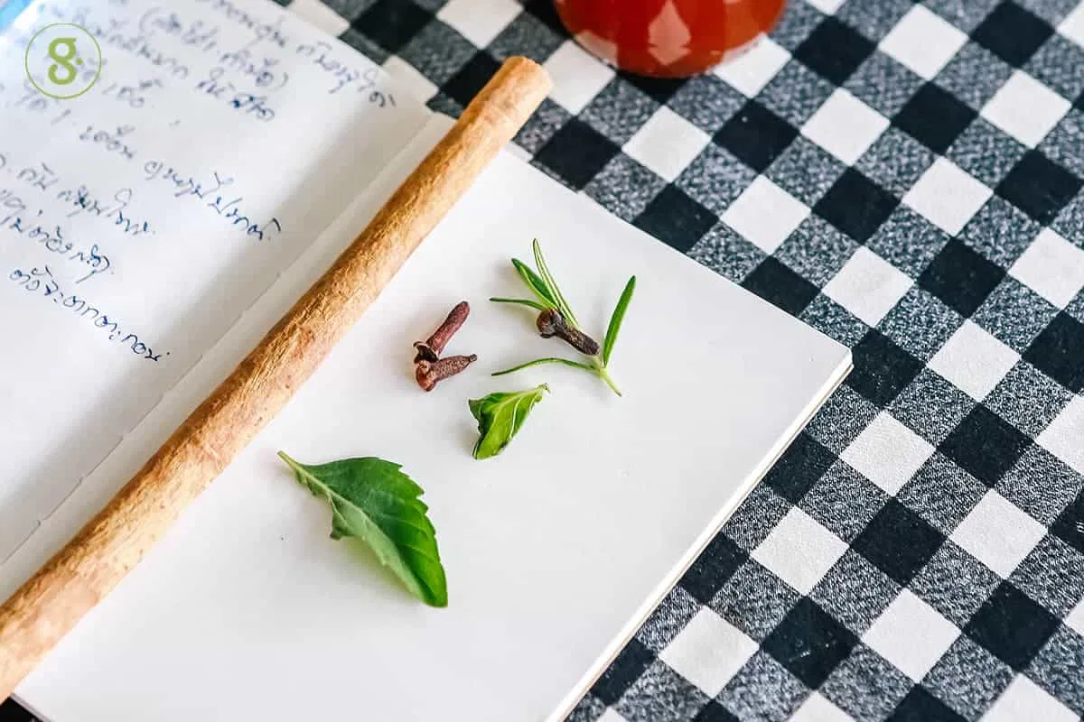 2. ใส่อบเชย 2-3 กำ กานพลู 1-2 ขีด โรสแมรี่แห้ง 1 หยิบมือใหญ่ สามารถลดและเพิ่มปริมาณได้ตามรสชาติที่ชอบ อบเชยให้รสหวาน กานพลูให้รสเผ็ด และโรสแมรี ถ้าใส่มากไปจะขม