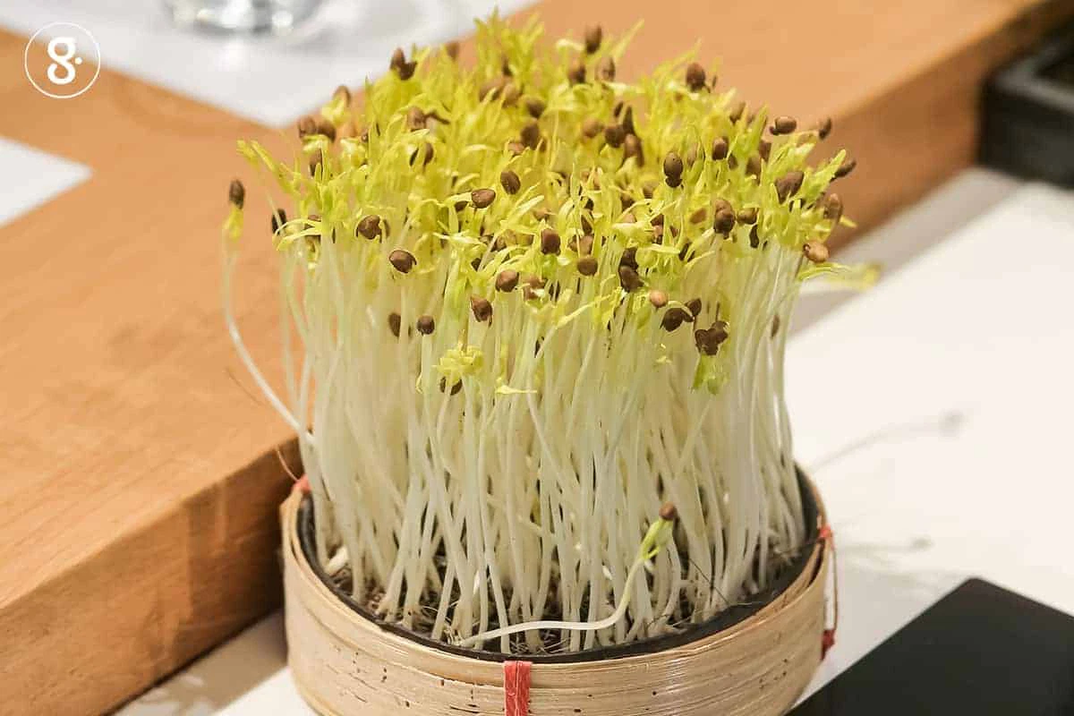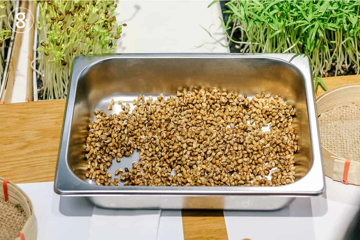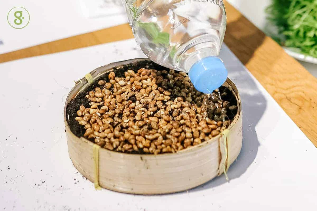 เริ่มปลูกโดยการวางผ้ากระสอบลงบนภาชนะ แล้วเกลี่ยดินให้เต็มภาชนะ จากนั้นโรยเมล็ดลงไปบนหน้าดิน โดยโรยให้แต่ละเมล็ดวางตัวไม่ซ้อนกัน เอามือกดเมล็ดลงในดินเบาๆ ให้เมล็ดจมลงไปสัก ½ เม็ด แล้วรดน้ำให้ดินซึมน้ำสักครึ่งภาชนะปลูก หลังจากนั้นให้คลุมหน้าภาชนะปลูกด้วยหนังสือพิมพ์หรือผ้ากระสอบ 1 ชั้น หาของหนักประมาณ 1 กิโลกรัม ทับไว้ในช่วง 2 วันแรก รดน้ำวันละ 2 ครั้ง และหมั่นตรวจสอบให้ดินชุ่มน้ำตลอดเวลา