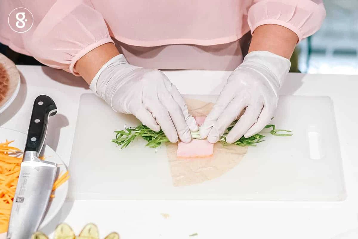 3. วางแฮมและแครอทลงกลางแผ่นแป้ง ส่วนต้นผักบุ้งอ่อนให้วางไว้ 2 ด้านของตัวไส้ หั่นปลายต้นอ่อนออกแต่ละด้าน เพื่อที่เมื่อหั่นออกมาแล้ว ผักบุ้งจะได้โผล่ออกจากตัวแป้ง 2 ด้านเท่าๆ กัน